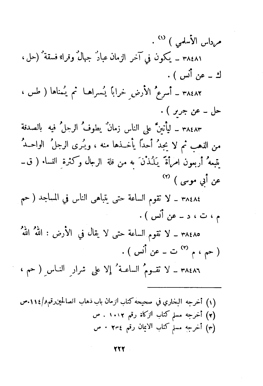 38483- "ليأتين على الناس زمان يطوف الرجل فيه بالصدقة من الذهب ثم لا يجد أحدا يأخذها منه، ويرى الرجل الواحد يتبعه أربعون امرأة يلذن به من قلة الرجال وكثرة النساء." ق - عن أبي موسى" 2