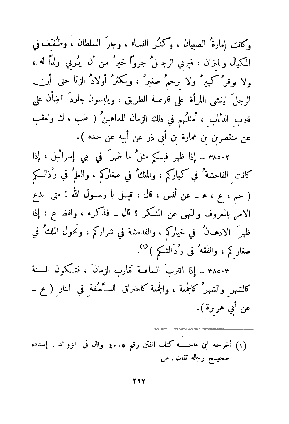 وكانت إمارة الصبيان، وكثر النساء، وجار السلطان، وطفف في المكيال والميزان، فيربي الرجل جروا خير من أن يربي ولدا له، ولا يوقر كبير ولا يرحم صغير، ويكثر أولاد الزنا حتى أن الرجل ليغشى المرأة على قارعة الطريق، ويلبسون جلود الضأن على قلوب الذئاب، أمثلهم في ذلك الزمان المداهن." طب، ك وتعقب عن منتصرين بن عمارة بن أبي ذر عن أبيه عن جده".