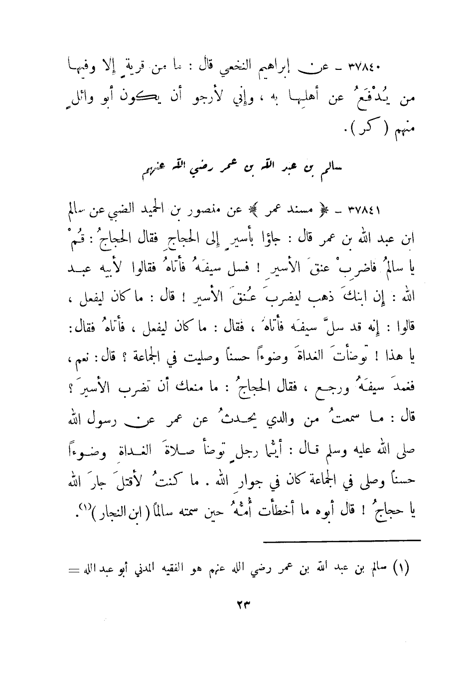 37841- "مسند عمر" عن منصور بن الحميد الضبي عن سالم ابن عبد الله بن عمر قال: جاؤا بأسير إلى الحجاج فقال الحجاج: قم يا سالم فاضرب عنق الأسير! فسل سيفه فأتاه فقالوا لأبيه عبد الله: إن ابنك ذهب ليضرب عنق الأسير! قال: ما كان ليفعل، قالوا: إنه قد سل سيفه فأتاه، فقال: ما كان ليفعل، فأتاه فقال: يا هذا! توضأت الغداة وضوءا حسنا وصليت في الجماعة؟ قال: نعم، فغمد سيفه ورجع، فقال الحجاج: ما منعك أن تضرب الأسير؟ قال: ما سمعت من والدي يحدث عن عمر عن رسول الله صلى الله عليه وسلم قال: "أيما رجل توضأ صلاة الغداة وضوءا حسنا وصلى في الجماعة كان في جوار الله". ما كنت لأقتل جار الله يا حجاج! قال أبوه ما أخطأت أمه حين سمته سالما" ابن النجار" 1.