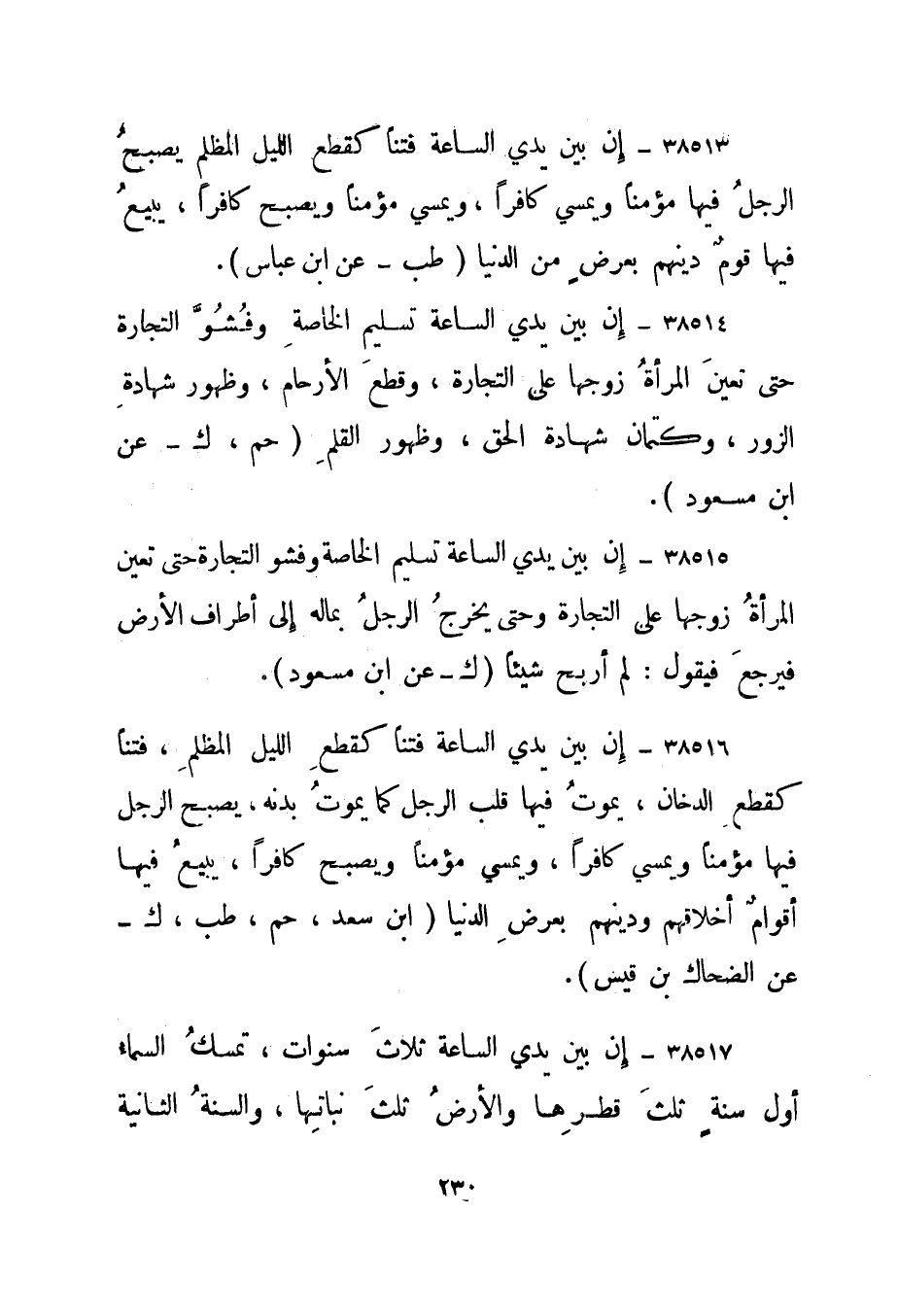 38517- "إن بين يدي الساعة ثلاث سنوات، تمسك السماء أول سنة ثلث قطرها والأرض ثلث نباتها، والسنة الثانية
