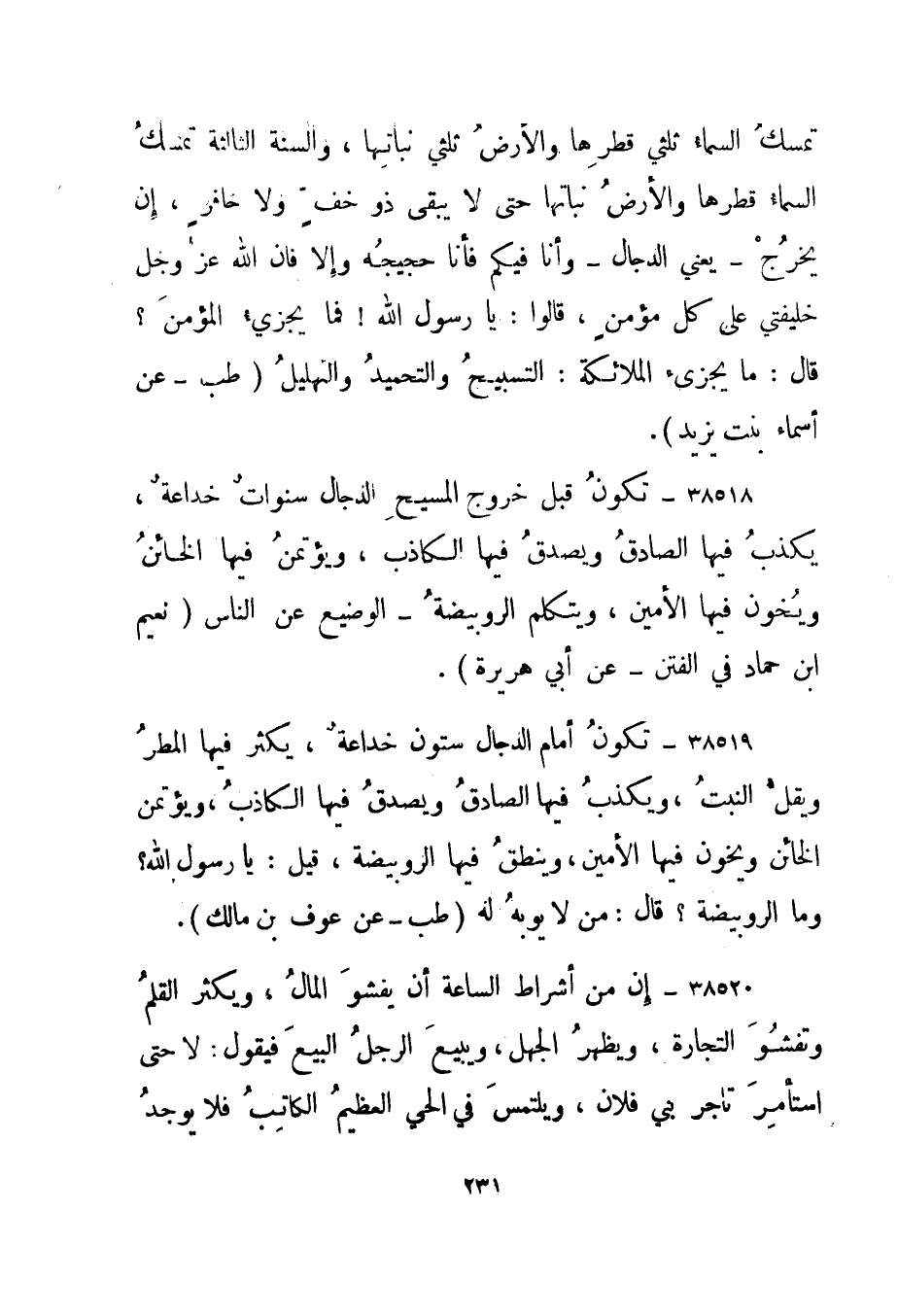 38518- "تكون قبل خروج المسيح الدجال سنوات خداعة، يكذب فيها الصادق ويصدق فيها الكاذب، ويؤتمن فيها الخائن ويخون فيها الأمين، ويتكلم الرويبضة - الوضيع عن الناس." نعيم ابن حماد في الفتن - عن أبي هريرة".