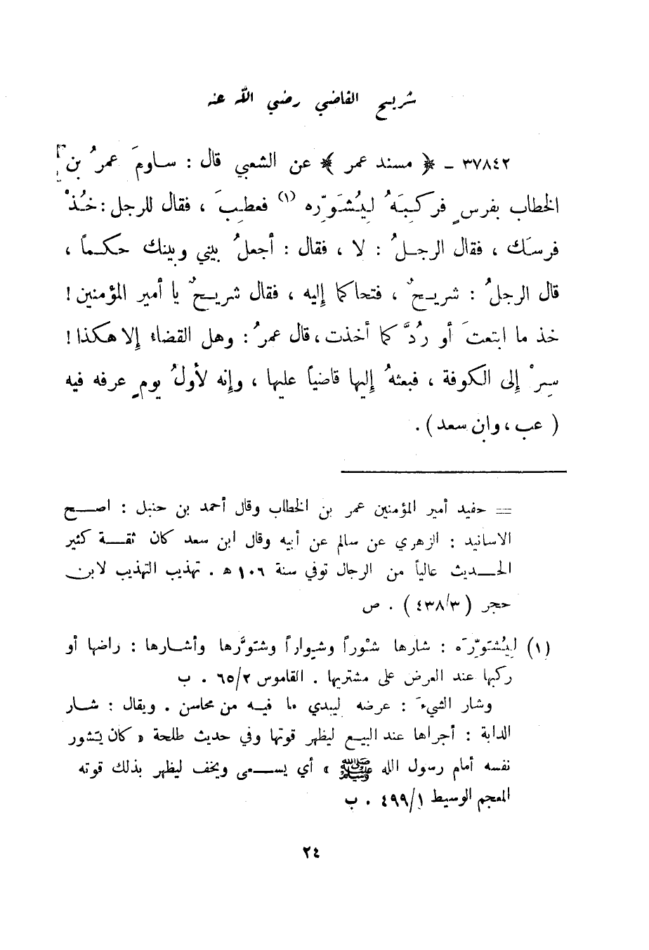 37842- "مسند عمر" عن الشعبي قال: ساوم عمر بن الخطاب بفرس فركبه ليشوره1 فعطب، فقال الرجل: خذ فرسك، فقال الرجل: لا، فقال: أجعل بيني وبينك حكما، قال الرجل: شريح، فتحاكما إليه، فقال شريح يا أمير المؤمنين! خذ ما ابتعت أو رد كما أخذت، قال عمر: وهل القضاء إلا هكذا! سر إلى الكوفة، فبعثه إليها قاضيا عليها، وإنه لأول يوم عرفه فيه."عب، وابن سعد".