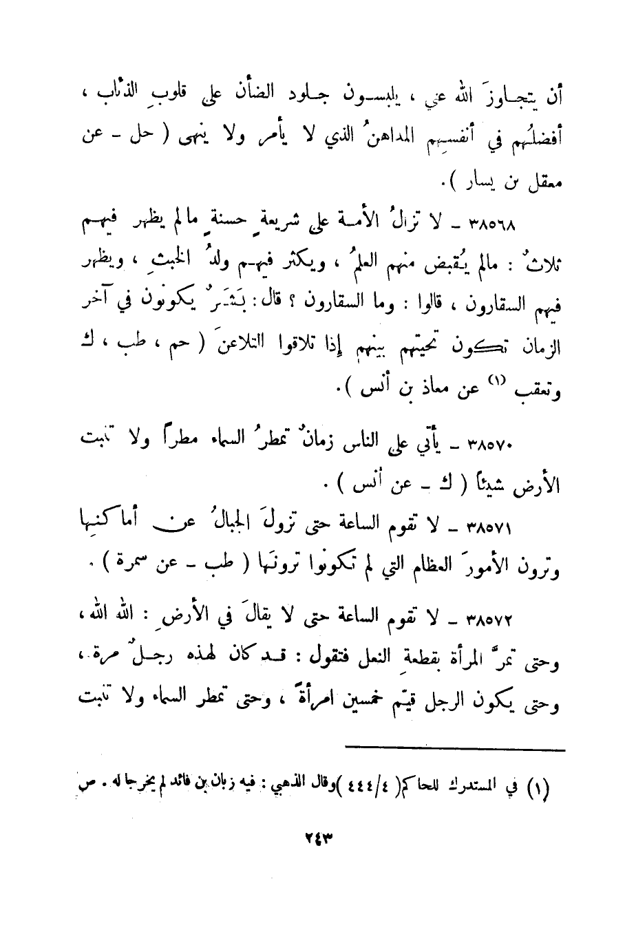 38568- "لا تزال الأمة على شريعة حسنة ما لم يظهر فيهم ثلاث: ما لم يقبض منهم العلم، ويكثر فيهم ولد الخبث، ويظهر فيهم السقارون، قالوا: وما السقارون؟ قال: بشر يكونون في آخر الزمان تكون تحيتهم بينهم إذا تلاقوا التلاعن." حم، طب، ك وتعقب1 عن معاذ بن أنس".