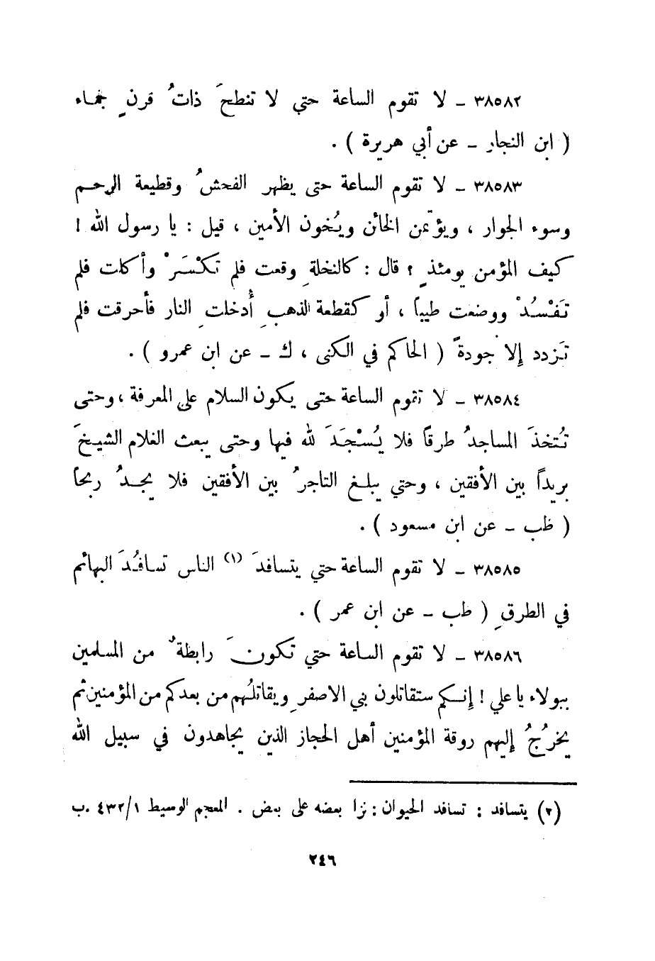 38585- "لا تقوم الساعة حتى يتسافد1 الناس تسافد البهائم في الطرق." طب - عن ابن عمر".