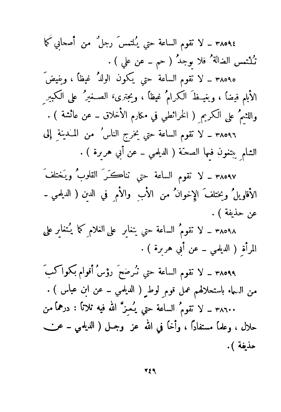 38594- "لا تقوم الساعة حتى يلتمس رجل من أصحابي كما تلتمس الضالة فلا يوجد." حم - عن علي".