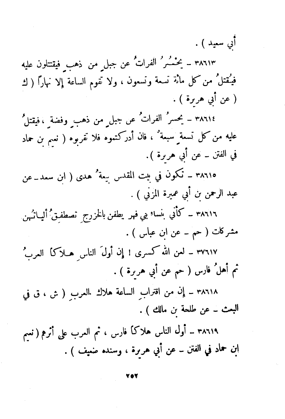 38614- "يحسر الفرات عن جبل من ذهب وفضة، فيقتل عليه من كل تسعة سبعة، فإن أدركتموه فلا تقربوه." نعيم بن حماد في الفتن - عن أبي هريرة".