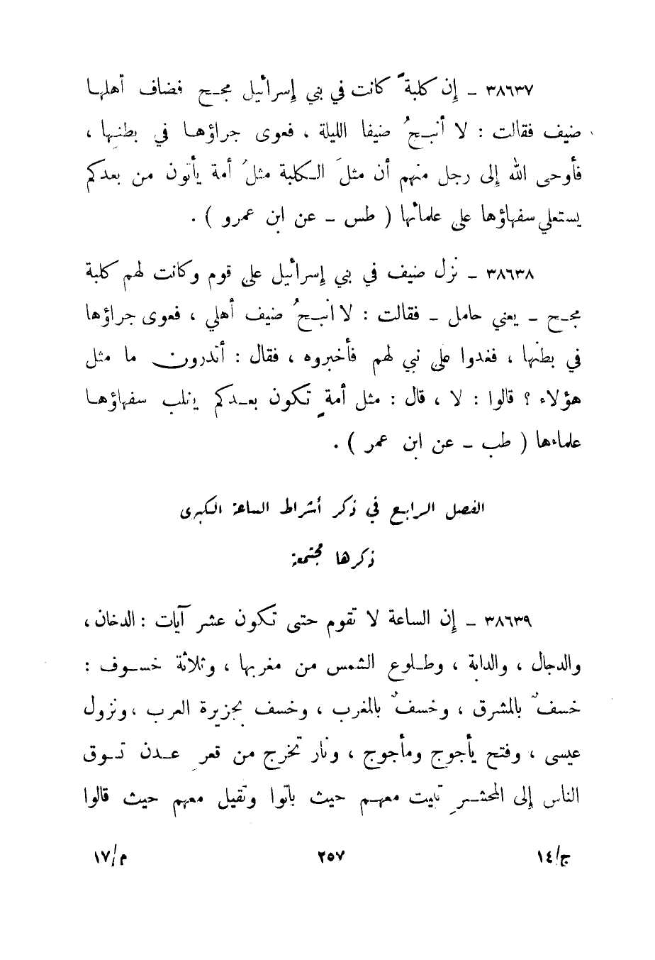 38637- "إن كلبة كانت في بني إسرائيل مجح فضاف أهلها ضيف فقالت: لا أنبح ضيفا الليلة، فعوى جراؤها في بطنها، فأوحى الله إلى رجل منهم أن مثل الكلبة مثل أمة يأتون من بعدكم يستعلي سفهاؤها على علمائها." طس - عن ابن عمرو".
