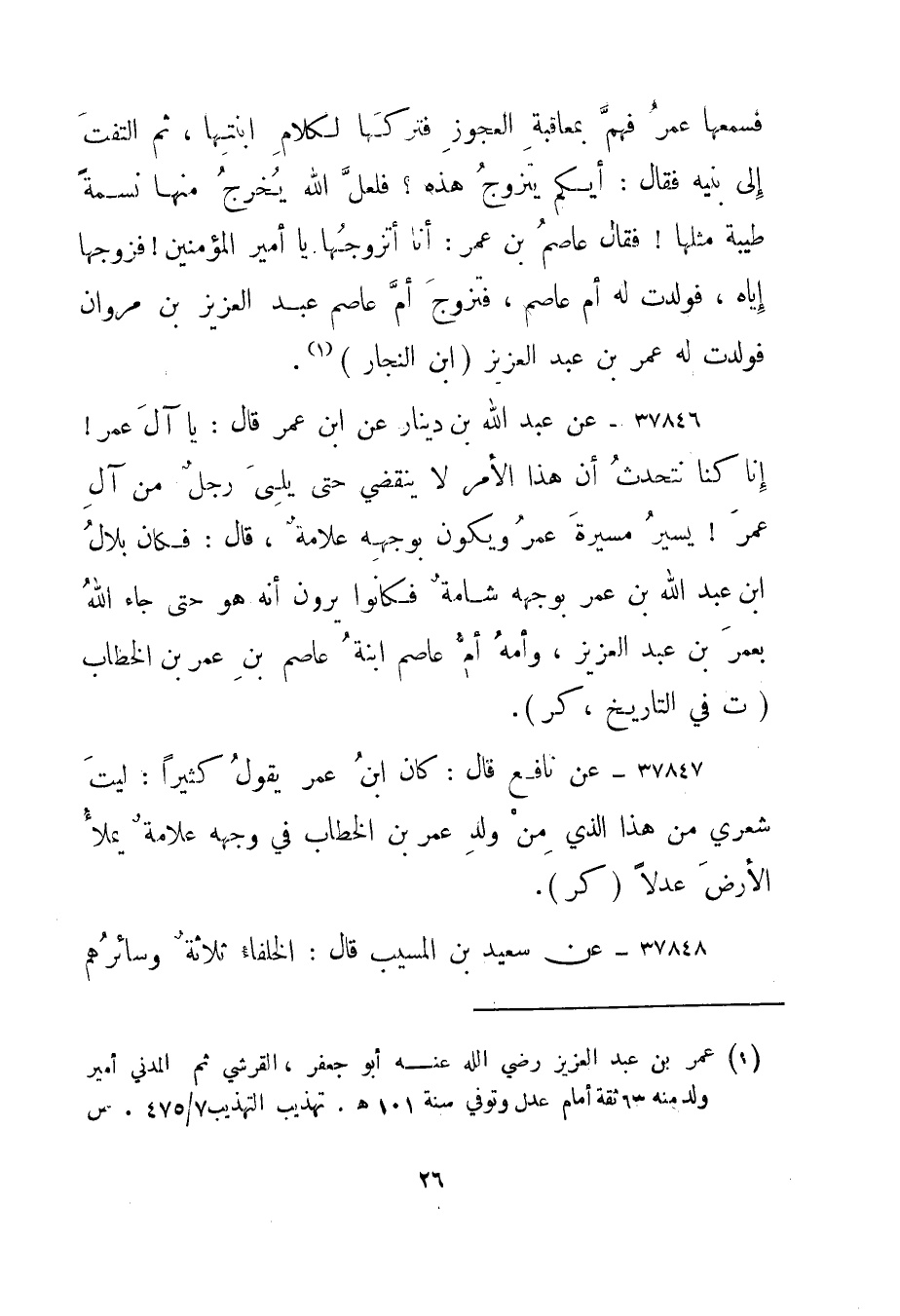 37846- عن عبد الله بن دينار عن ابن عمر قال: يا آل عمر! إنا كنا نتحدث أن هذا الأمر لا ينقضي حتى يلى رجل من آل عمر! يسير مسيرة عمر ويكون بوجهه علامة، قال: فكان بلال ابن عبد الله بن عمر بوجهه شامة فكانوا يرون أنه هو حتى جاء الله بعمر بن عبد العزيز، وأمه أم عاصم ابنة عاصم بن عمر بن الخطاب."ت في التاريخ، كر".