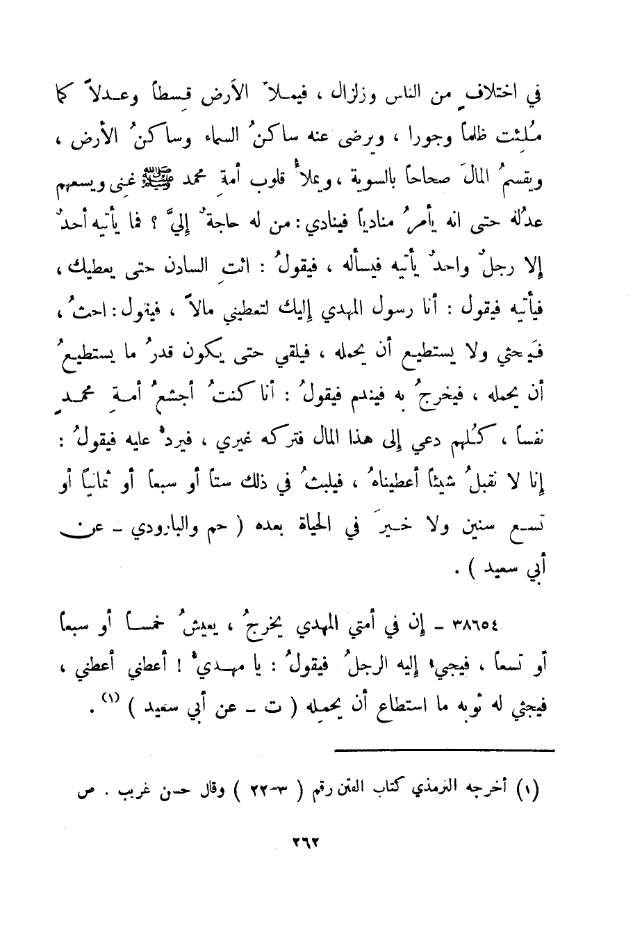38654- "إن في أمتي المهدي يخرج، يعيش خمسا أو سبعا أو تسعا، فيجيء إليه الرجل فيقول: يا مهدي! أعطني أعطني، فيجثي له ثوبه ما استطاع أن يحمله." ت - عن أبي سعيد"1
