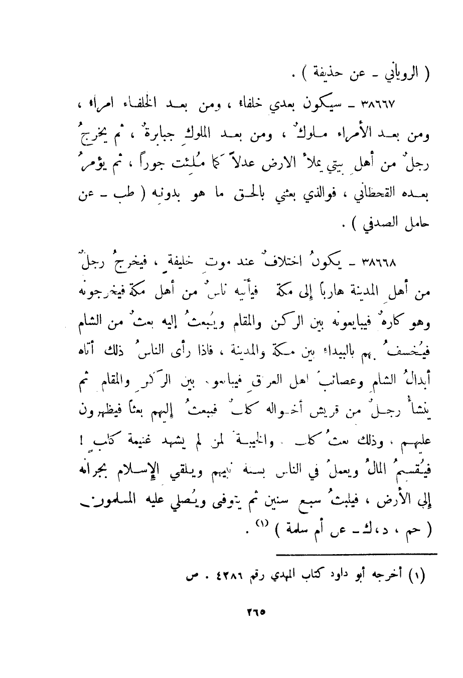 38668- "يكون اختلاف عند موت خليفة، فيخرج رجل من أهل المدينة هاربا إلى مكة فيأتيه ناس من أهل مكة فيخرجونه وهو كاره فيبايعونه بين الركن والمقام ويبعث إليه بعث من الشام فيخسف بهم بالبيداء بين مكة والمدينة، فإذا رأى الناس ذلك أتاه أبدال الشام وعصائب أهل العراق فيبايعوه بين الركن والمقام ثم ينشأ رجل من قريش أخواله كلب، فيبعث إليهم بعثا فيظهرون عليهم وذلك بعث كلب. والخيبة لمن لم يشهد غنيمة كلب! فيقسم المال ويعمل في الناس بسنة نبيهم ويلقي الإسلام بجرانه إلى الأرض، فيلبث سبع سنين ثم يتوفى ويصلي عليه المسلمون." حم، د، ك - عن أم سلمة" 1