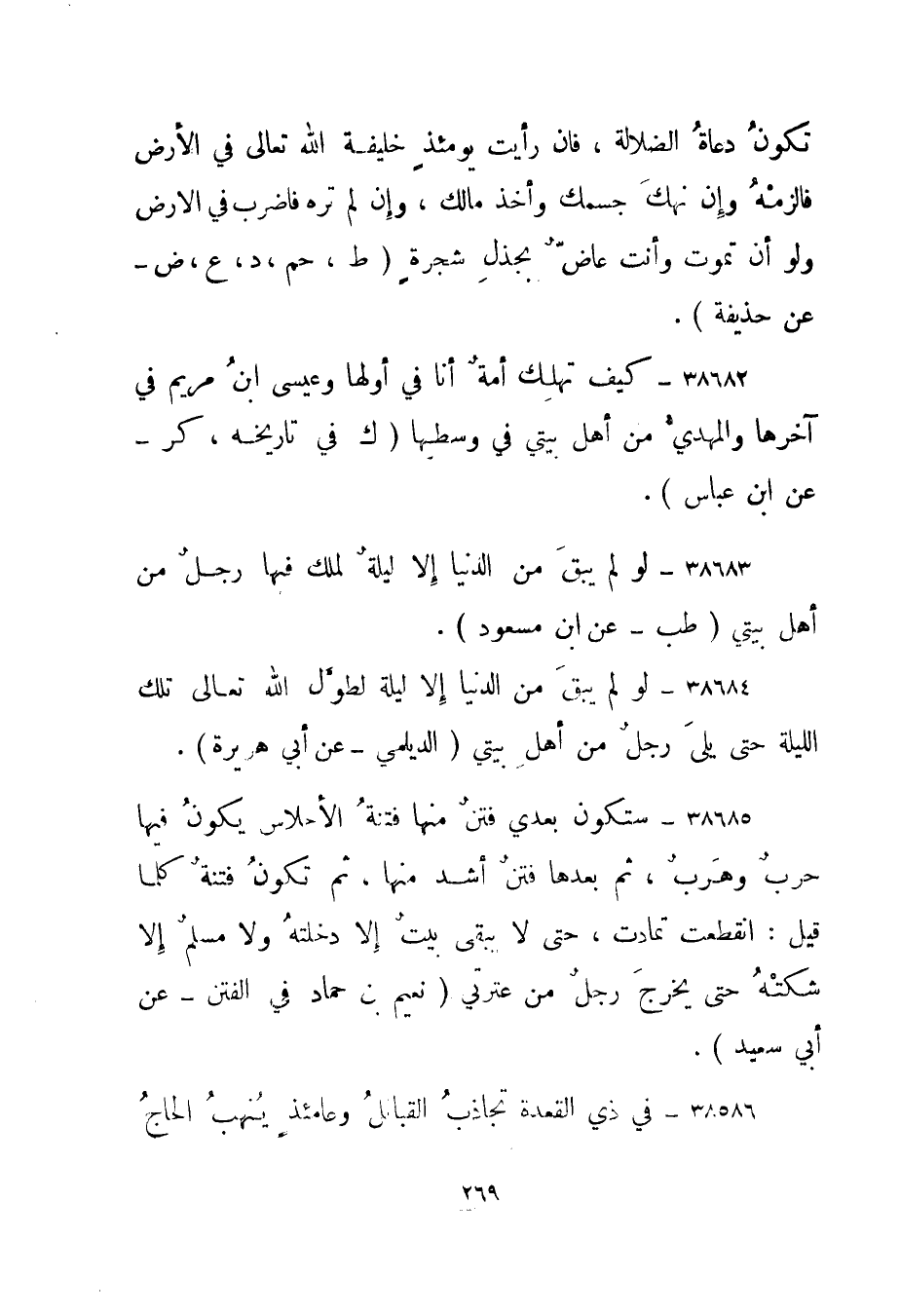 38684- "لو لم يبق من الدنيا إلا ليلة لطول الله تعالى تلك الليلة حتى يلى رجل من أهل بيتي." الديلمي - عن أبي هريرة".