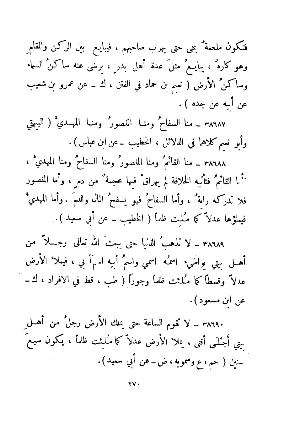 38688- "منا القائم ومنا المنصور ومنا السفاح ومنا المهدي، فأما القائم فتأتيه الخلافة لم يهراق فيها محجمة من دم، وأما المنصور فلا تدركه راية، وأما السفاح فهو يسفح المال والدم، وأما المهدي فيملؤها عدلا كما ملت ظلما." الخطيب - عن أبي سعيد".
