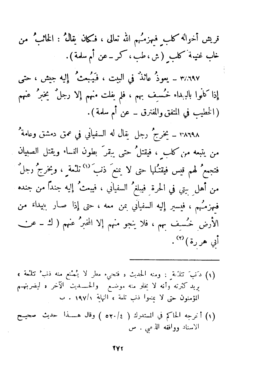38698- "يخرج رجل يقال له السفياني في عمق دمشق وعامة من يتبعه من كلب، فيقتل حتى يبقر بطون النساء ويقتل الصبيان فتجمع لهم قيس فيقتلها حتى لا يمنع ذنب 1 تلعة، ويخرج رجل من أهل بيتي في الحرة فيبلغ السفياني، فيبعث إليه جندا من جنده فيهزمهم، فيسير إليه السفياني بمن معه، حتى إذا صار ببيداء من الأرض خسف بهم، فلا ينجو منهم إلا المخبر عنهم. " ك - عن أبي هريرة" 2
