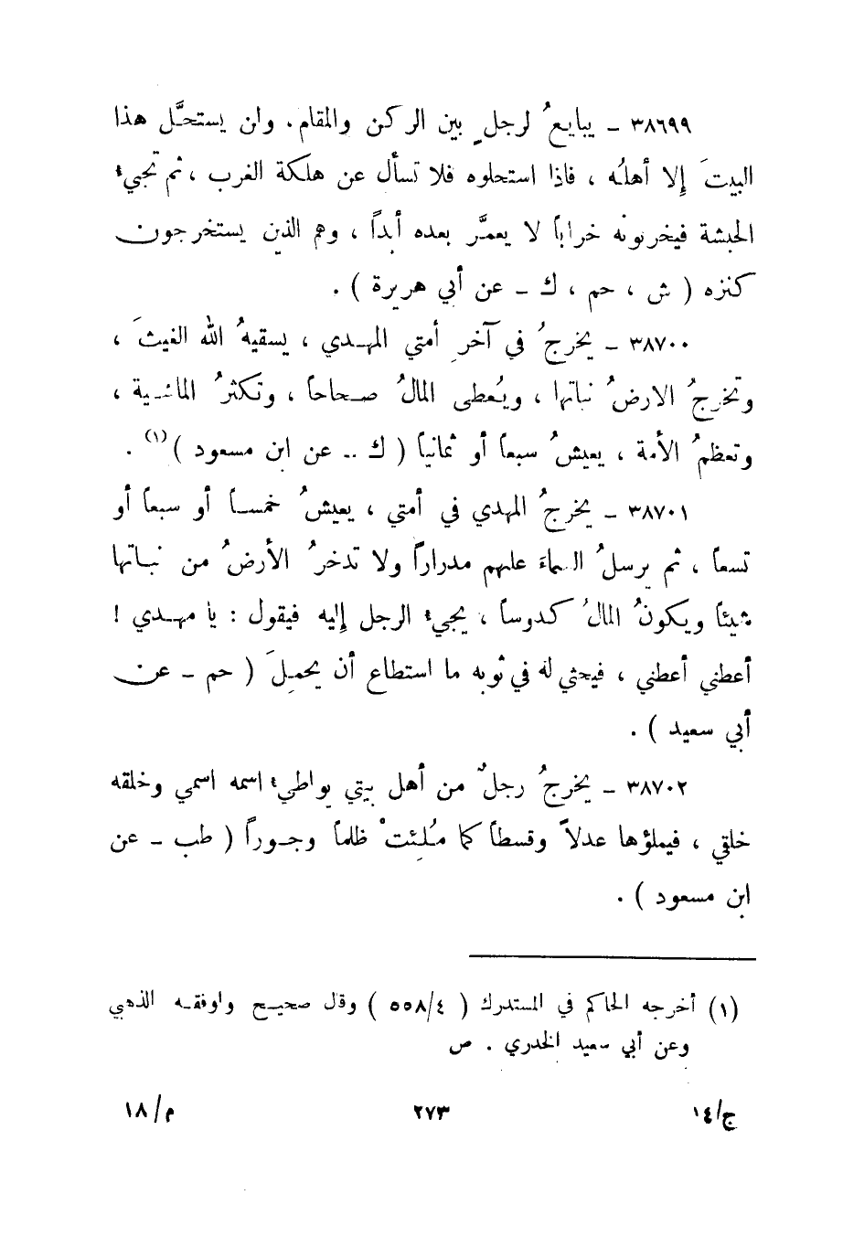 38700- "يخرج في آخر أمتي المهدي، يسقيه الله الغيث، وتخرج الأرض نباتها، ويعطى المال صحاحا، وتكثر الماشية، وتعظم الأمة، يعيش سبعا أو ثمانيا." ك - عن ابن مسعود"1