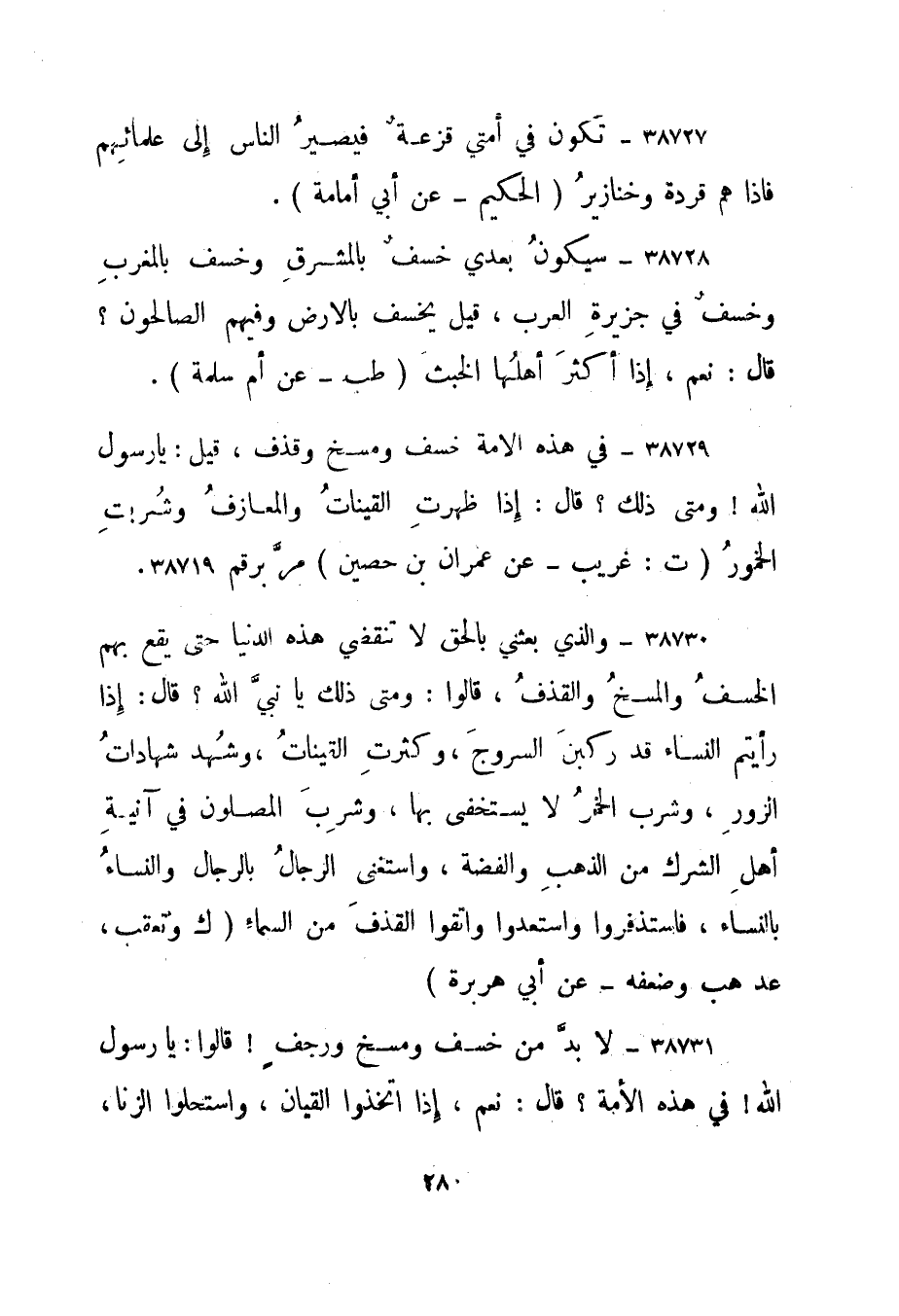 38729- "في هذه الأمة خسف ومسخ وقذف، قيل: يا رسول الله! ومتى ذلك؟ قال: إذا ظهرت القينات والمعازف وشربت الخمور." ت: غريب - عن عمران بن حصين" مر برقم 38719.