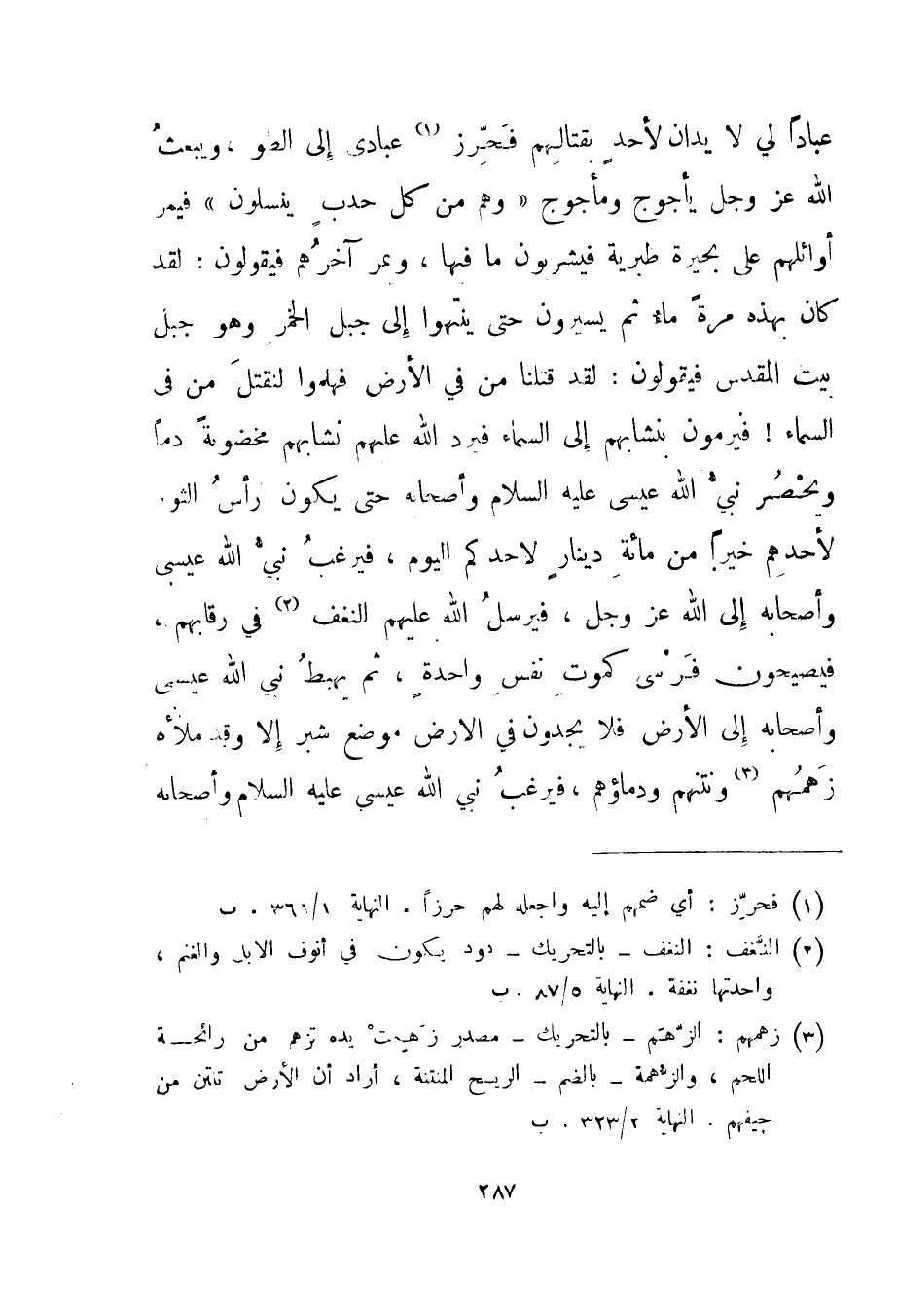 عبادا لي لا يدان لأحد بقتالهم فحرز1 عبادى إلى الطو، ويبعث الله عز وجل يأجوج ومأجوج {وَهُمْ مِنْ كُلِّ حَدَبٍ يَنْسِلُونَ} فيمر أوائلهم على بحيرة طبرية فيشربون ما فيها، ويمر آخرهم فيقولون: لقد كان بهذه مرة ماء ثم يسيرون حتى ينتهوا إلى جبل الخمر وهو جبل بيت المقدس فيقولون: لقد قتلنا من في الأرض فهلموا لنقتل من في السماء! فيرمون بنشابهم إلى السماء فيرد الله عليهم نشابهم مخضوبة دما ويحصر نبي الله عيسى عليه السلام وأصحابه حتى يكون رأس الثور لأحدهم خيرا من مائة دينار لأحدكم اليوم، فيرغب نبي الله عيسى وأصحابه إلى الله عز وجل، فيرسل الله عليهم النغف2 في رقابهم، فيصيحون فرسي كموت نفس واحدة، ثم يهبط نبي الله عيسى وأصحابه إلى الأرض فلا يجدون في الأرض موضع شبر إلا وقد ملأه زهمهم3 ونتنهم ودماؤهم. فيرغب نبي الله عيسى عليه السلام وأصحابه