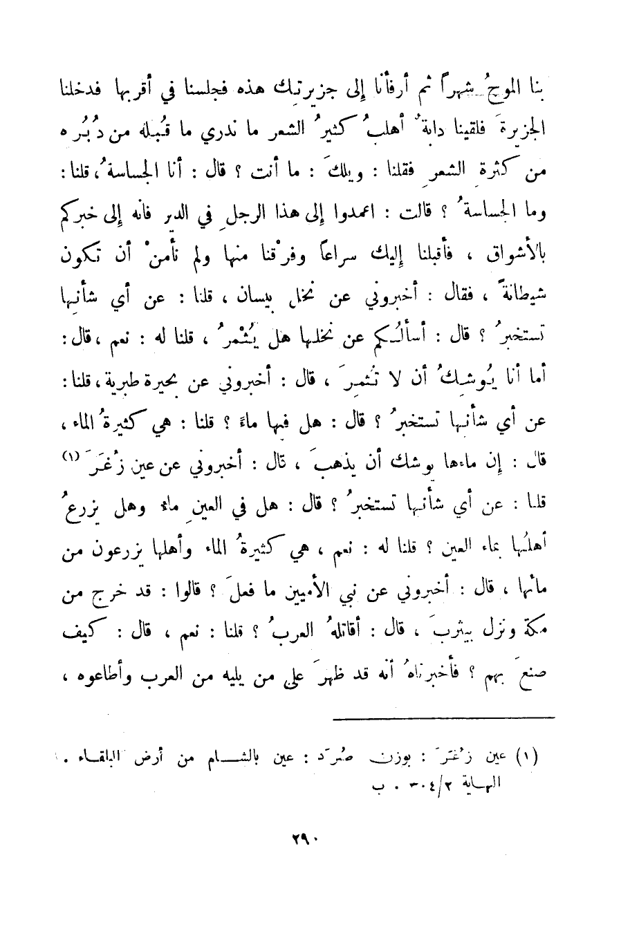بنا الموج شهرا ثم أرفأنا إلى جزيرتك هذه فجلسنا في أقربها فدخلنا الجزيرة فلقينا دابة أهلب كثير الشعر ما ندري ما قبله من دبره من كثرة الشعر فقلنا: ويلك: ما أنت؟ قال: أنا الجساسة، قلنا: وما الجساسة؟ قالت: اعمدوا إلى هذا الرجل في الدير فإنه إلى خبركم بالأشواق، فأقبلنا إليك سراعا وفرقنا منها ولم نأمن أن تكون شيطانة. فقال: أخبروني عن نخل بيسان، قلنا: عن أي شأنها تستخبر؟ قال: أسألكم عن نخلها هل يثمر، قلنا له: نعم، قال: أما أنا يوشك أن لا تثمر، قال: أخبروني عن بحيرة طبرية، قلنا: عن أي شأنها تستخبر؟ قال: هل فيها ماء؟ قلنا: هي كثيرة الماء، قال: إن ماءها يوشك أن يذهب، قال: أخبروني عن عين زغر1 قلنا: عن أي شأنها تستخبر؟ قال: هل في العين ماء وهل يزرع أهلها بماء العين؟ قلنا له: نعم، هي كثيرة الماء وأهلها يزرعون من مائها، قال: أخبروني عن نبي الأميين ما فعل؟ قالوا: قد خرج من مكة ونزل بيثرب، قال: أقاتله العرب؟ قلنا: نعم، قال: كيف صنع بهم؟ فأخبرناه أنه قد ظهر على من يليه من العرب وأطاعوه،
