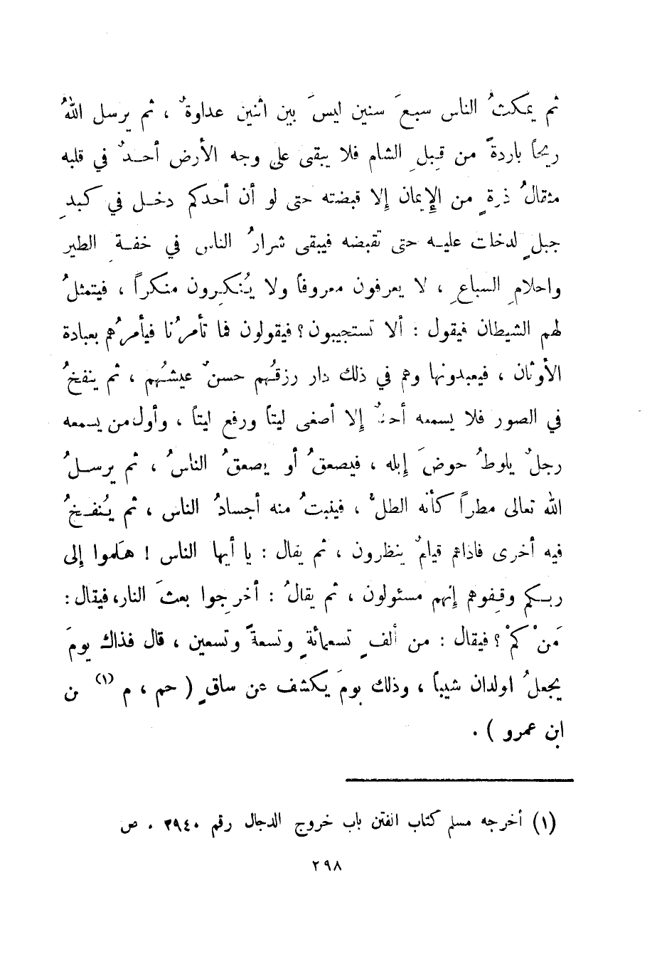 ثم يمكث الناس سبع سنين ليس بين اثنين عداوة، ثم يرسل الله ريحا باردة من قبل الشام فلا يبقى على وجه الأرض أحد في قلبه مثقال ذرة من الإيمان إلا قبضته حتى لو أن أحدكم دخل في كبد جبل لدخلت عليه حتى تقبضه فيبقى شرار الناس في خفة الطير وإحلام السباع، لا يعرفون معروفا ولا ينكرون منكرا، فيتمثل لهم الشيطان فيقول: ألا تستجيبون؟ فيقولون فما تأمرنا فيأمرهم بعبادة الأوثان، فيعبدونها وهم في ذلك دار رزقهم حسن عيشهم، ثم ينفخ في الصور فلا يسمعه أحد إلا أصغى ليتا ورفع ليتا، وأول من يسمعه رجل يلوط حوض إبله، فيصعق أو يصعق الناس، ثم يرسل الله تعالى مطرا كأنه الطل، فينبت منه أجساد الناس، ثم ينفخ فيه أخرى فإذا هم قيام ينظرون، ثم يقال: يا أيها الناس! هلموا إلى ربكم وقفوهم إنهم مسئولون، ثم يقال: أخرجوا بعث النار، فيقال: من كم؟ فيقال: من ألف تسعمائة وتسعة وتسعين، قال فذاك يوم يجعل الولدان شيبا، وذلك يوم يكشف عن ساق." حم، م1 عن ابن عمرو".