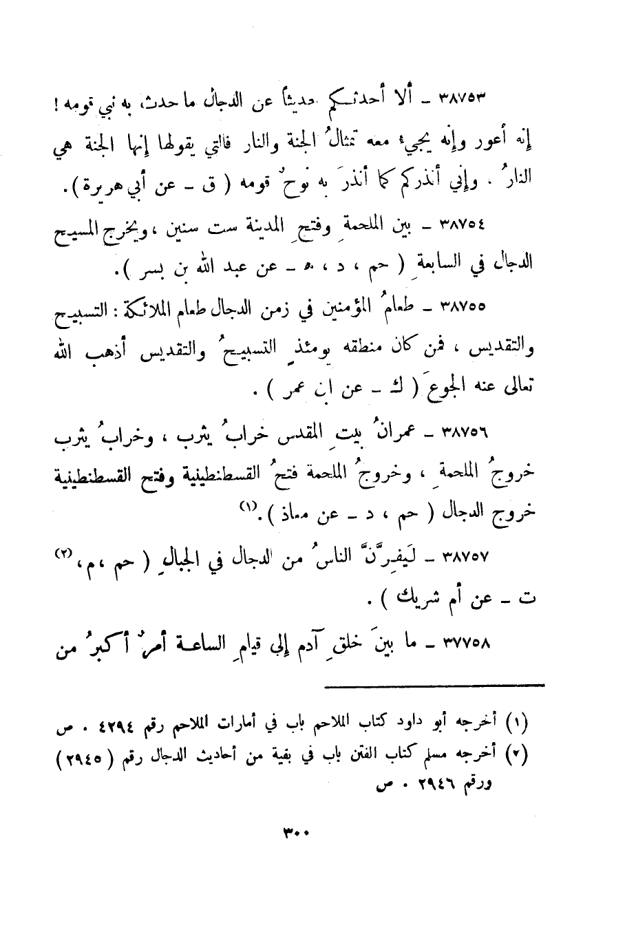 38756- "عمران بيت المقدس خراب يثرب، وخراب يثرب خروج الملحمة، وخروج الملحمة فتح القسطنطينية وفتح القسطنطينية خروج الدجال." حم، د - عن معاذ"1