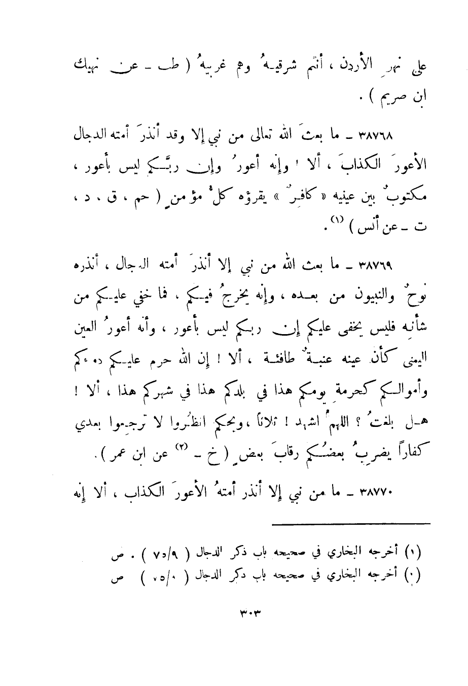 38769- "ما بعث الله من نبي إلا أنذر أمته الدجال، أنذره نوح والنبيون من بعده، وإنه يخرج فيكم، فما خفي عليكم من شأنه فليس يخفى عليكم إن ربكم ليس بأعور، وأنه أعور العين اليمنى كأن عينه عنبة طافئة، ألا! إن الله حرم عليكم دماءكم وأموالكم كحرمة يومكم هذا في بلدكم هذا في شهركم هذا، ألا! هل بلغت؟ اللهم اشهد! ثلاثا، ويحكم انظروا لا ترجعوا بعدي كفارا يضرب بعضكم رقاب بعض." خ -2 عن ابن عمر".
