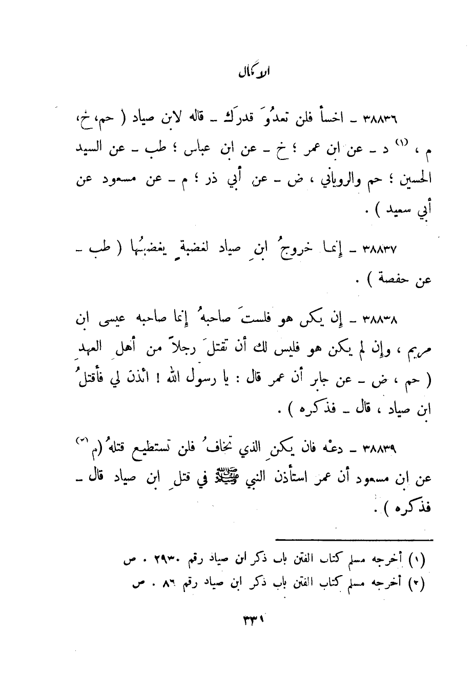 38839- "دعه فإن يكن الذي تخاف فلن تستطيع قتله." م2 عن ابن مسعود أن عمر استأذن النبي صلى الله عليه وسلم في قتل ابن صياد قال - فذكره".