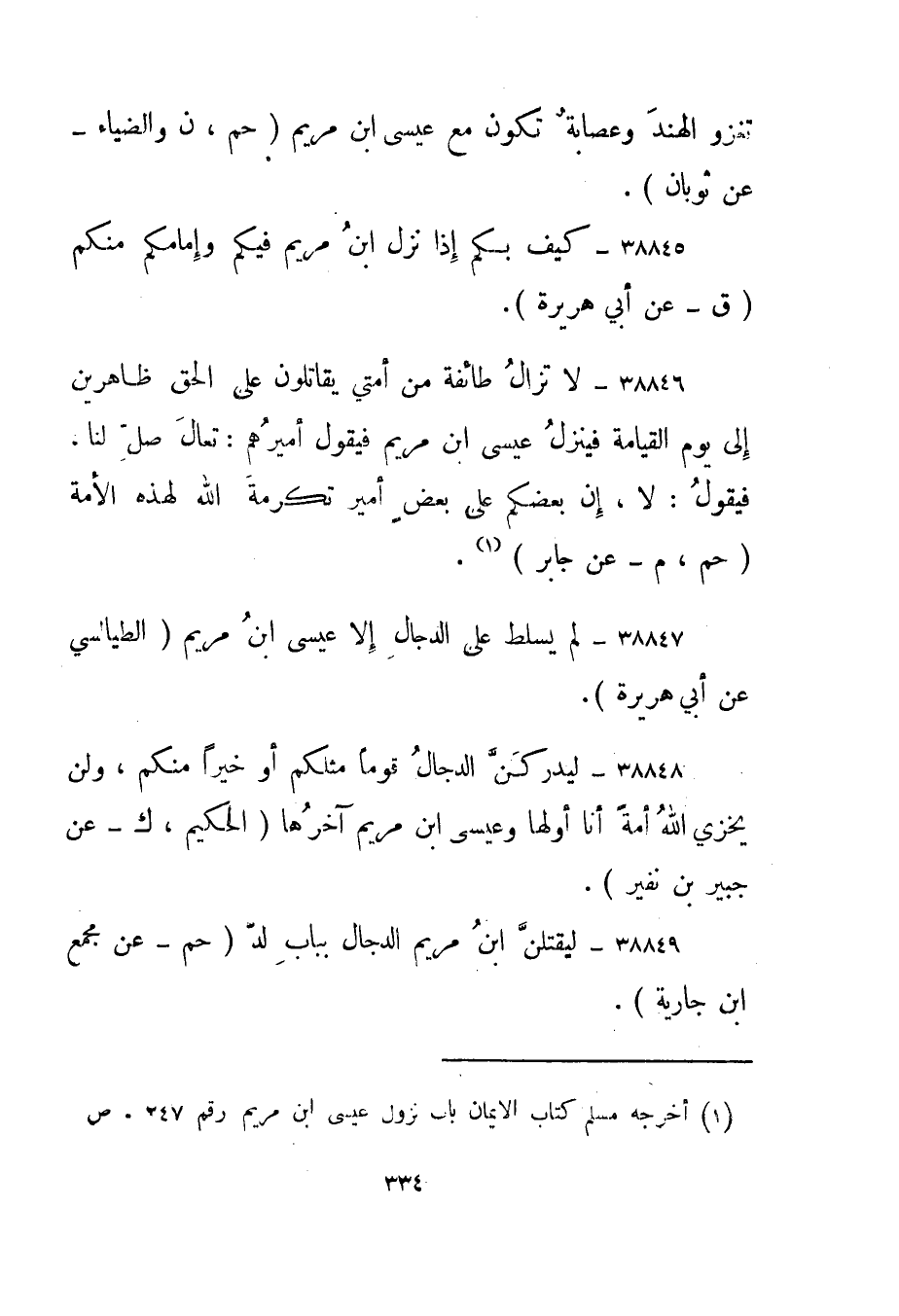 38848- "ليدركن الدجال قوما مثلكم أو خيرا منكم، ولن يخزي الله أمة أنا أولها وعيسى ابن مريم آخرها." الحكيم، ك - عن جبير بن نفير".
