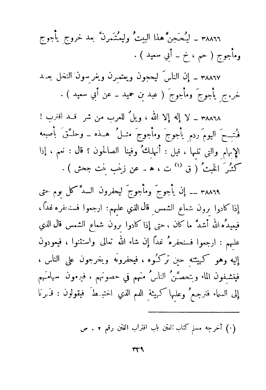 38866- "ليحجن هذا البيت وليعتمرن بعد خروج يأجوج ومأجوج." حم، خ - أبي سعيد".