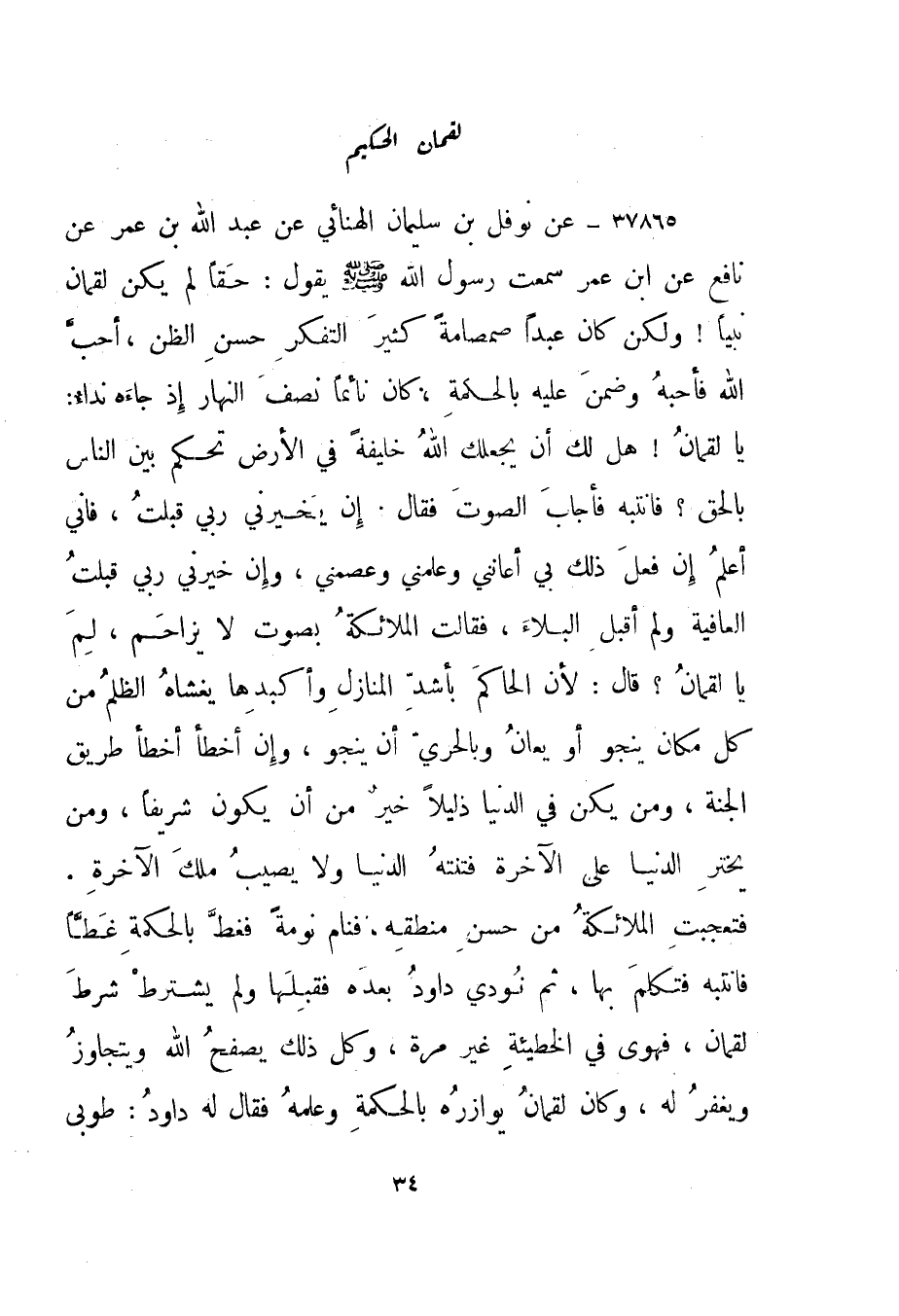 37865- عن نوفل بن سليمان الهنائي عن عبد الله بن عمر عن نافع عن ابن عمر سمعت رسول الله صلى الله عليه وسلم يقول: "حقا لم يكن لقمان نبيا! ولكن كان عبدا صمصامة كثير التفكر حسن الظن، أحب الله فأحبه وضمن عليه بالحكمة، كان نائما نصف النهار إذ جاءه نداء: يا لقمان! هل لك أن يجعلك الله خليفة في الأرض تحكم بين الناس بالحق؟ فانتبه فأجاب الصوت فقال: إن يخيرني ربي قبلت، فإني أعلم إن فعل ذلك بي أعانني وعلمني وعصمني، وإن خيرني ربي قبلت العافية ولم أقبل البلاء، فقالت الملائكة بصوت لا يزاحم، لم يا لقمان؟ قال: لأن الحاكم بأشد المنازل وأكبدها يغشاه الظلم من كل مكان ينجو أو يعان وبالحري أن ينجو، وإن أخطأ أخطأ طريق الجنة، ومن يكن في الدنيا ذليلا خير من أن يكون شريفا، ومن يختر الدنيا على الآخرة فتنته الدنيا ولا يصيب ملك الآخرة. فتعجبت الملائكة من حسن منطقه، فنام نومة فغط بالحكمة غطا فانتبه فتكلم بها، ثم نودي داود بعده فقبلها ولم يشترط شرط لقمان، فهوى في الخطيئة غير مرة، وكل ذلك يصفح الله ويتجاوز ويغفر له، وكان لقمان يوازره بالحكمة وعلمه فقال له داود: طوبى
