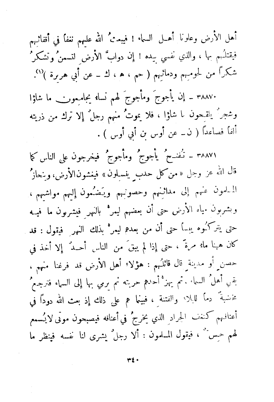 38870- "إن يأجوج ومأجوج لهم نساء يجامعون ماشاؤا وشجر يلقحون ما شاؤا، فلا يموت منهم رجل إلا ترك من ذريته ألفا فصاعدا." ن - عن أوس بن أبي أوس".