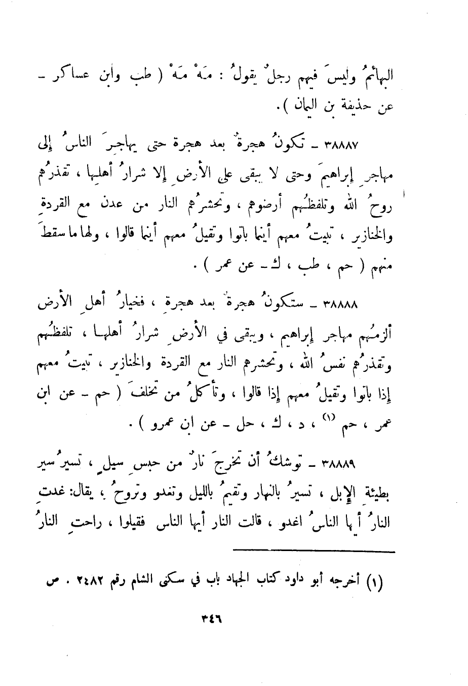 38888- "ستكون هجرة بعد هجرة، فخيار أهل الأرض ألزمهم مهاجر إبراهيم، ويبقى في الأرض شرار أهلها، تلفظهم وتقذرهم نفس الله، وتحشرهم النار مع القردة والخنازير، تبيت معهم إذا باتوا وتقيل معهم إذا قالوا، وتأكل من تخلف." حم - عن ابن عمر، حم 1، د، ك، حل - عن ابن عمرو".