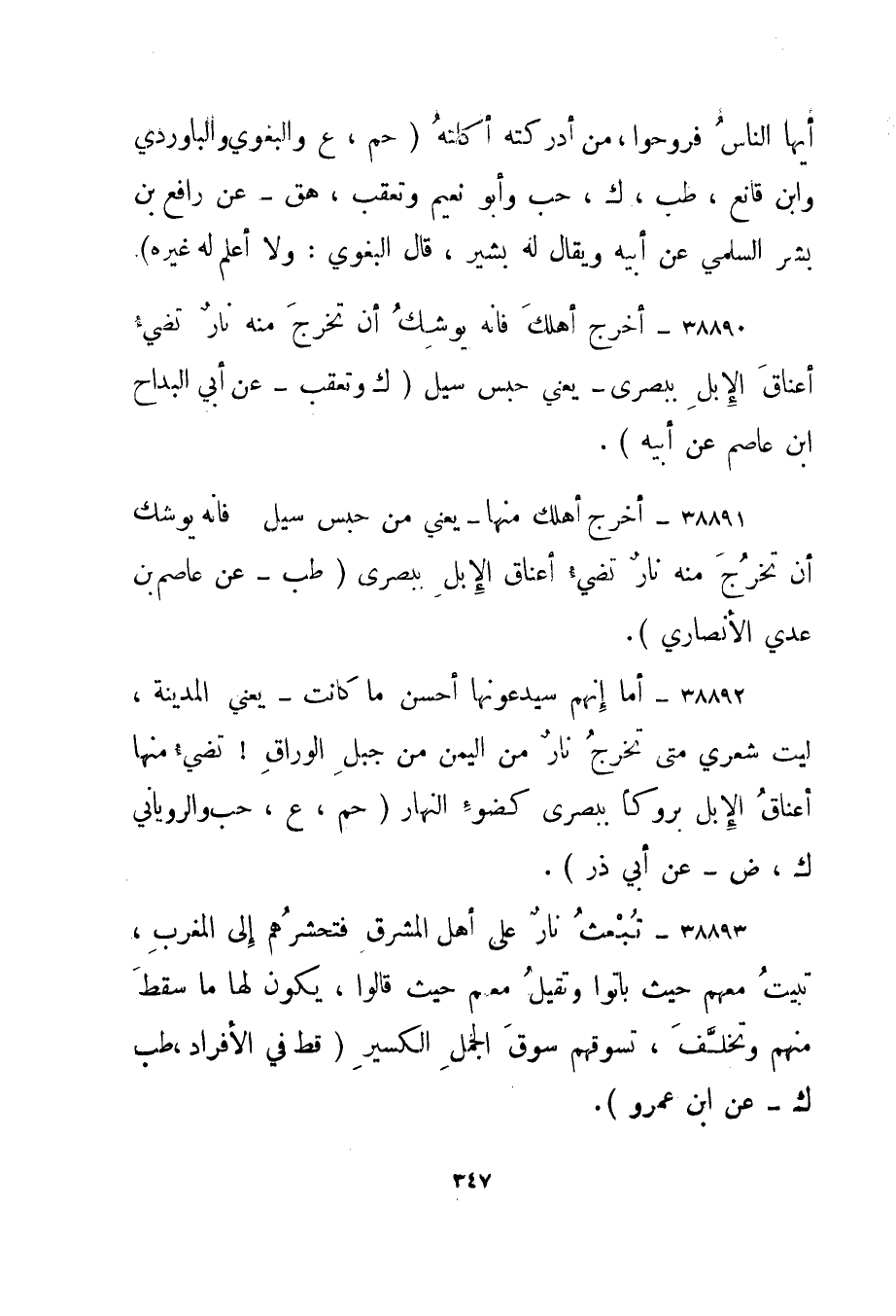 38890- "أخرج أهلك فإنه يوشك أن تخرج منه نار تضيء أعناق الإبل ببصرى - يعني حبس سيل." ك وتعقب - عن أبي البداح ابن عاصم عن أبيه".