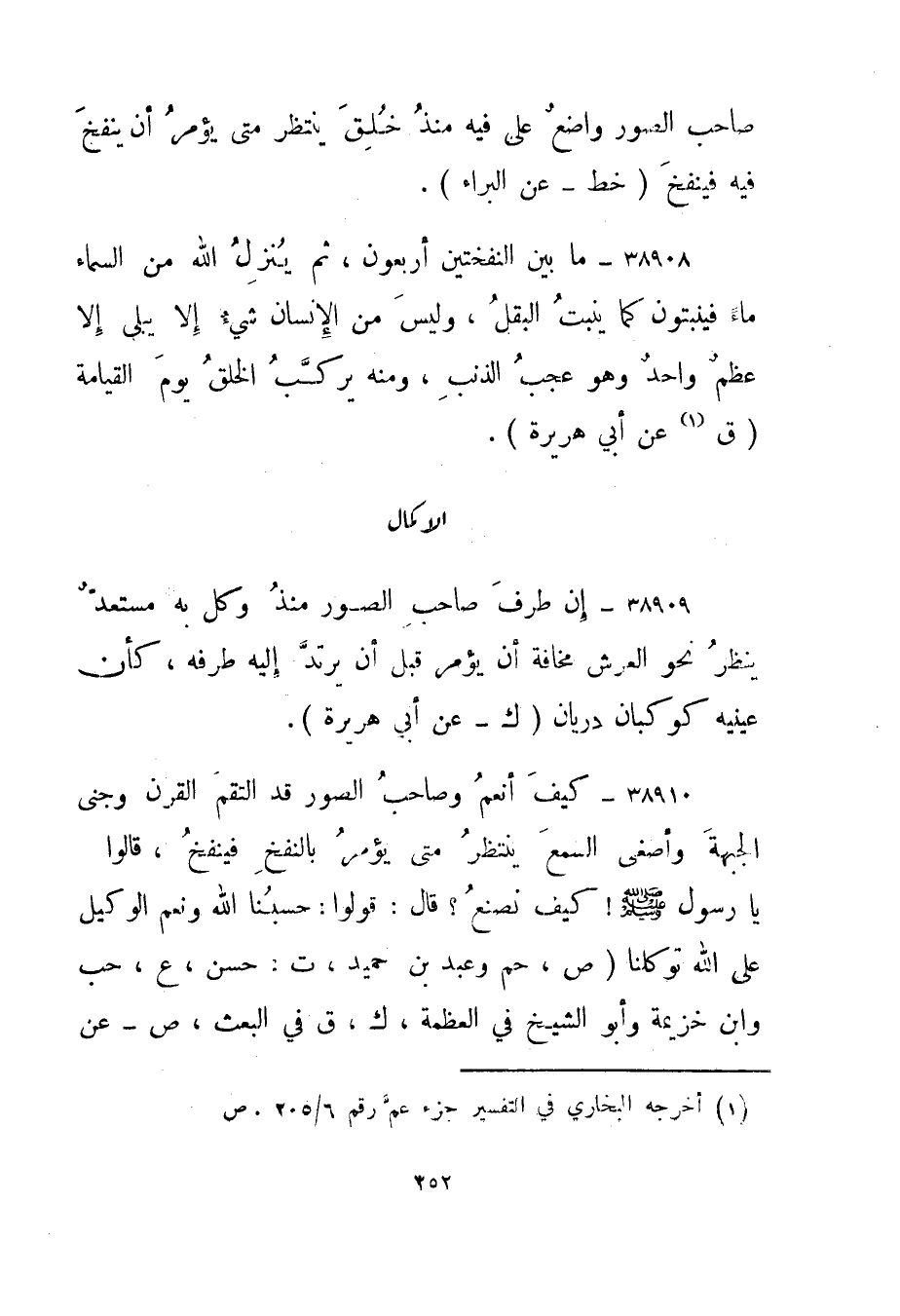 38910- " كيف أنعم وصاحب الصور قد التقم القرن وحنى الجبهة وأصغى السمع ينتظر متى يؤمر بالنفخ فينفخ، قالوا: يا رسول صلى الله عليه وسلم! كيف نصنع؟ قال: قولوا: حسبنا الله ونعم الوكيل على الله توكلنا." ص، حم وعبد بن حميد، ت: حسن، ع، حب وابن خزيمة وأبو الشيخ في العظمة، ك، ق في البعث، ص - عن