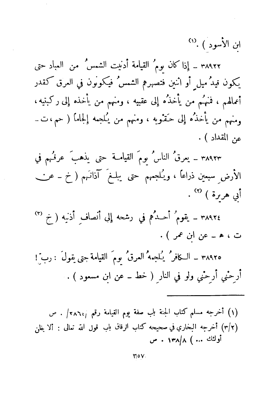 38922- "إذا كان يوم القيامة أدنيت الشمس من العباد حتى يكون قيد ميل أو اثنين فتصهرهم الشمس فيكونون في العرق كقدر أعمالهم، فمنهم من يأخذه إلى عقبيه، ومنهم من يأخذه إلى ركبتيه، ومنهم من يأخذه إلى حقويه، ومنهم من يلجمه إلجاما." حم، ت - عن المقداد".