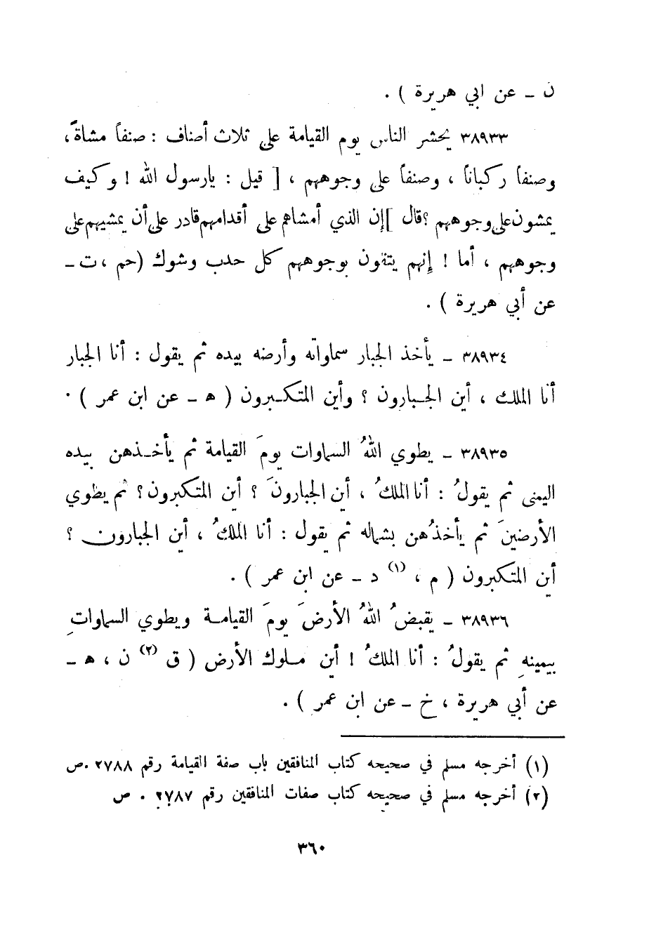 38936- "يقبض الله الأرض يوم القيامة ويطوي السماوات بيمينه ثم يقول: أنا الملك! أين ملوك الأرض." ق 2ن، هـ- عن أبي هريرة، خ - عن ابن عمر".