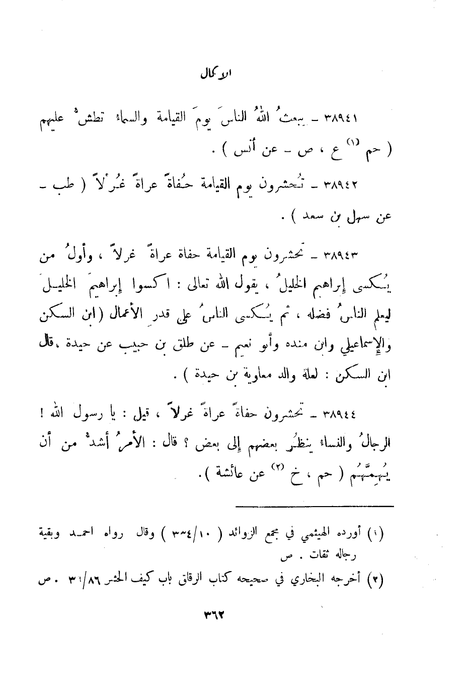 38943- "تحشرون يوم القيامة حفاة عراة غرلا، وأول من يكسى إبراهيم الخليل، يقول الله تعالى: اكسوا إبراهيم الخليل ليعلم الناس فضله، ثم يكسى الناس على قدر الأعمال." ابن السكن والإسماعيلي وابن منده وأبو نعيم - عن طلق بن حبيب عن حيدة، قال ابن السكن: لعلة والد معاوية بن حيدة".