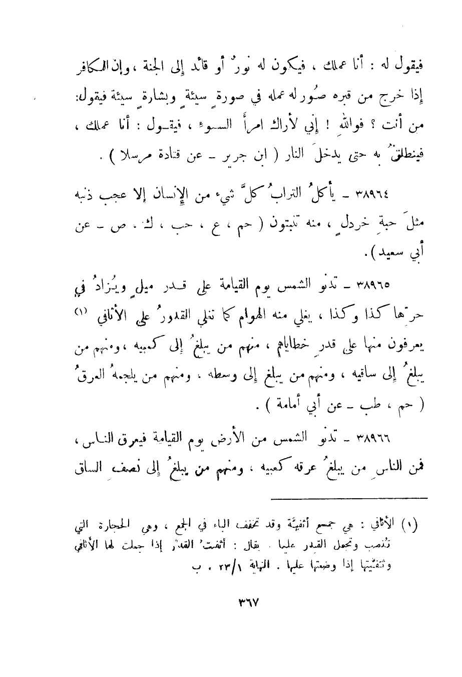38966- "تدنو الشمس من الأرض يوم القيامة فيعرق الناس، فمن الناس من يبلغ عرقه كعبيه، ومنهم من يبلغ إلى نصف الساق