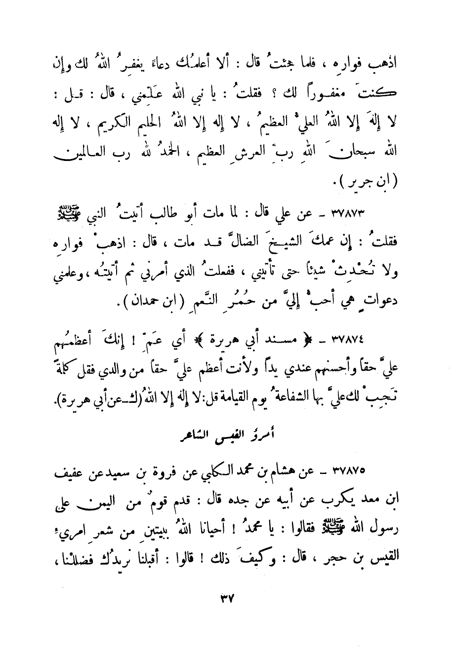37874- "مسند أبي هريرة" أي عم! إنك أعظمهم علي حقا وأحسنهم عندي يدا ولأنت أعظم علي حقا من والدي فقل كلمة تجب لك علي بها الشفاعة يوم القيامة قل: "لا إله إلا الله". "ك - عن أبي هريرة".