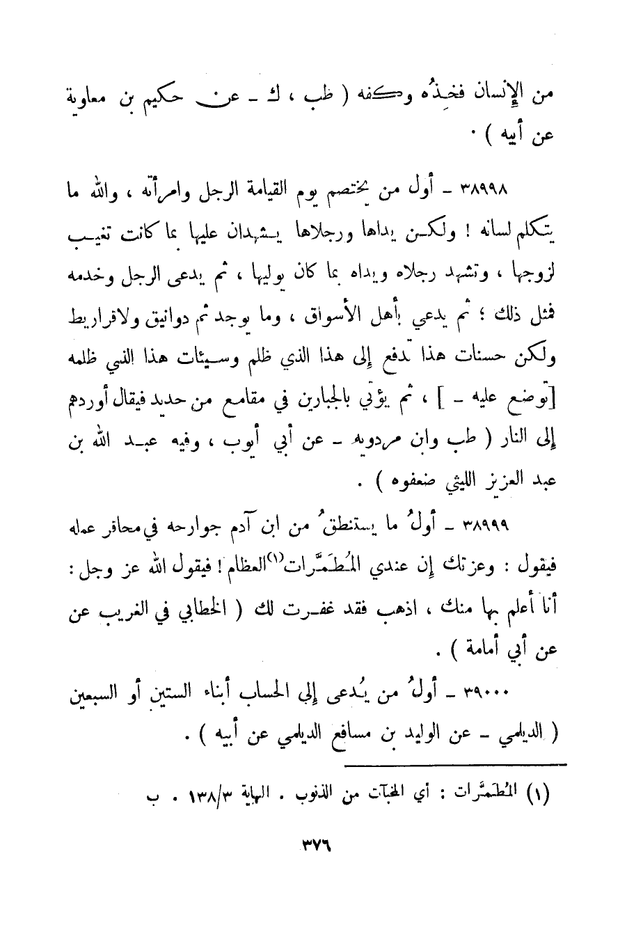 38999- "أول ما يستنطق من ابن آدم جوارحه في محاقر عمله فيقول: وعزتك إن عندي المطمرات1 العظام! فيقول الله عز وجل: أنا أعلم بها منك، اذهب فقد غفرت لك." الخطابي في الغريب عن أبي أمامة".