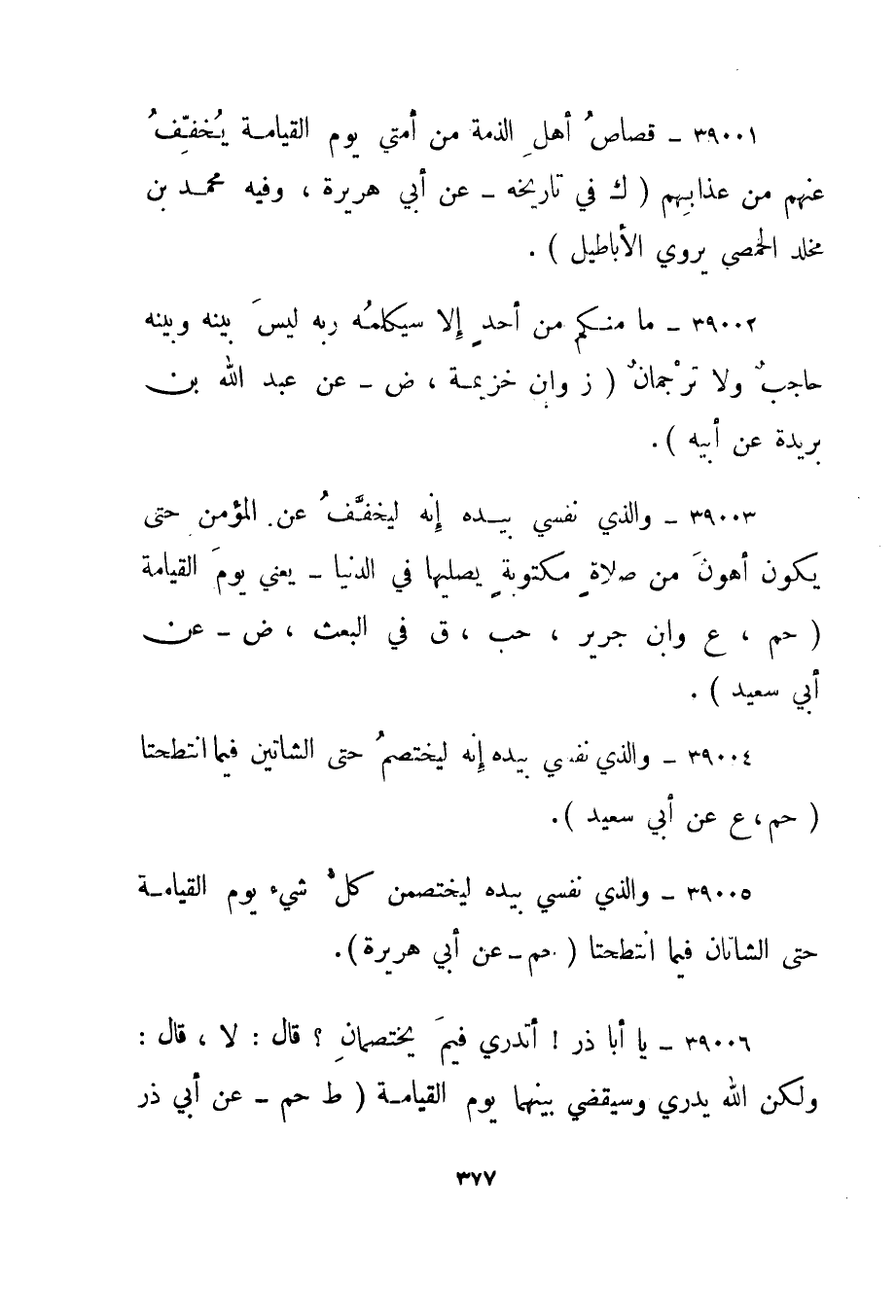39004- "والذي نفسي بيده إنه ليختصم حتى الشاتين فيما انتطحتا." حم، ع عن أبي سعيد".