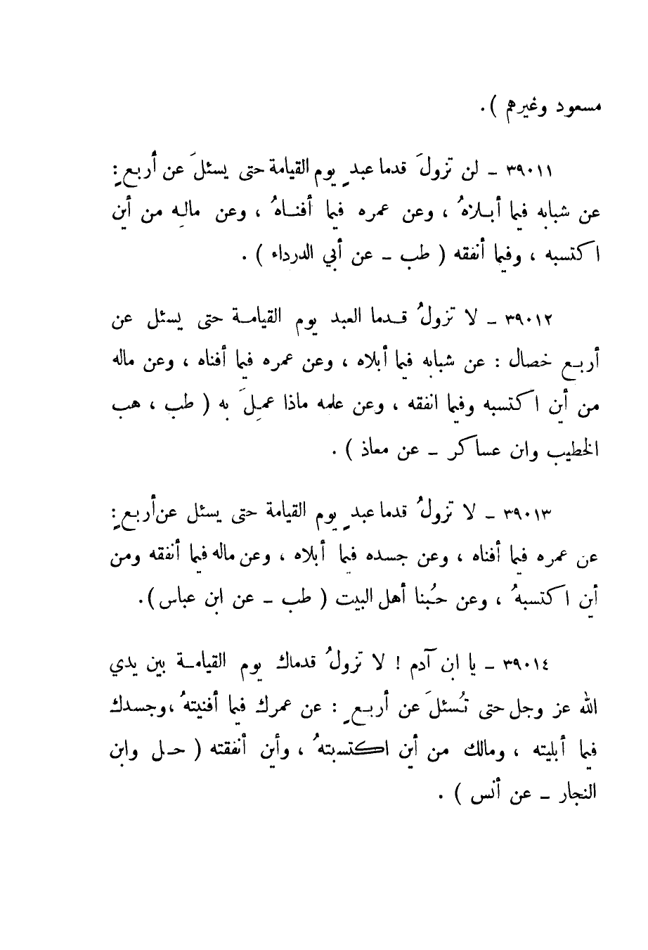 39011- "لن تزول قدما عبد يوم القيامة حتى يسئل عن أربع: عن شبابه فيما أبلاه، وعن عمره فيما أفناه، وعن ماله من أين اكتسبه، وفيما أنفقه." طب - عن أبي الدرداء".