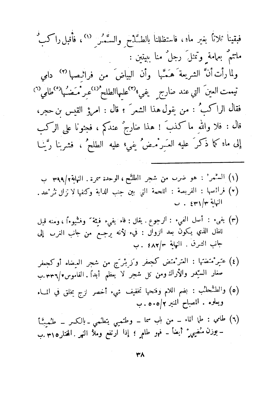 فقال الراكب: من يقول هذا الشعر؟ قال: امرؤ القيس بن حجر، قال: فلا والله ما كذب! هذا ضارج عندكم، فجثونا على الراكب إلى ماء كما ذكر عليه العرمض يفيء عليه الطلح، فشربنا رينا