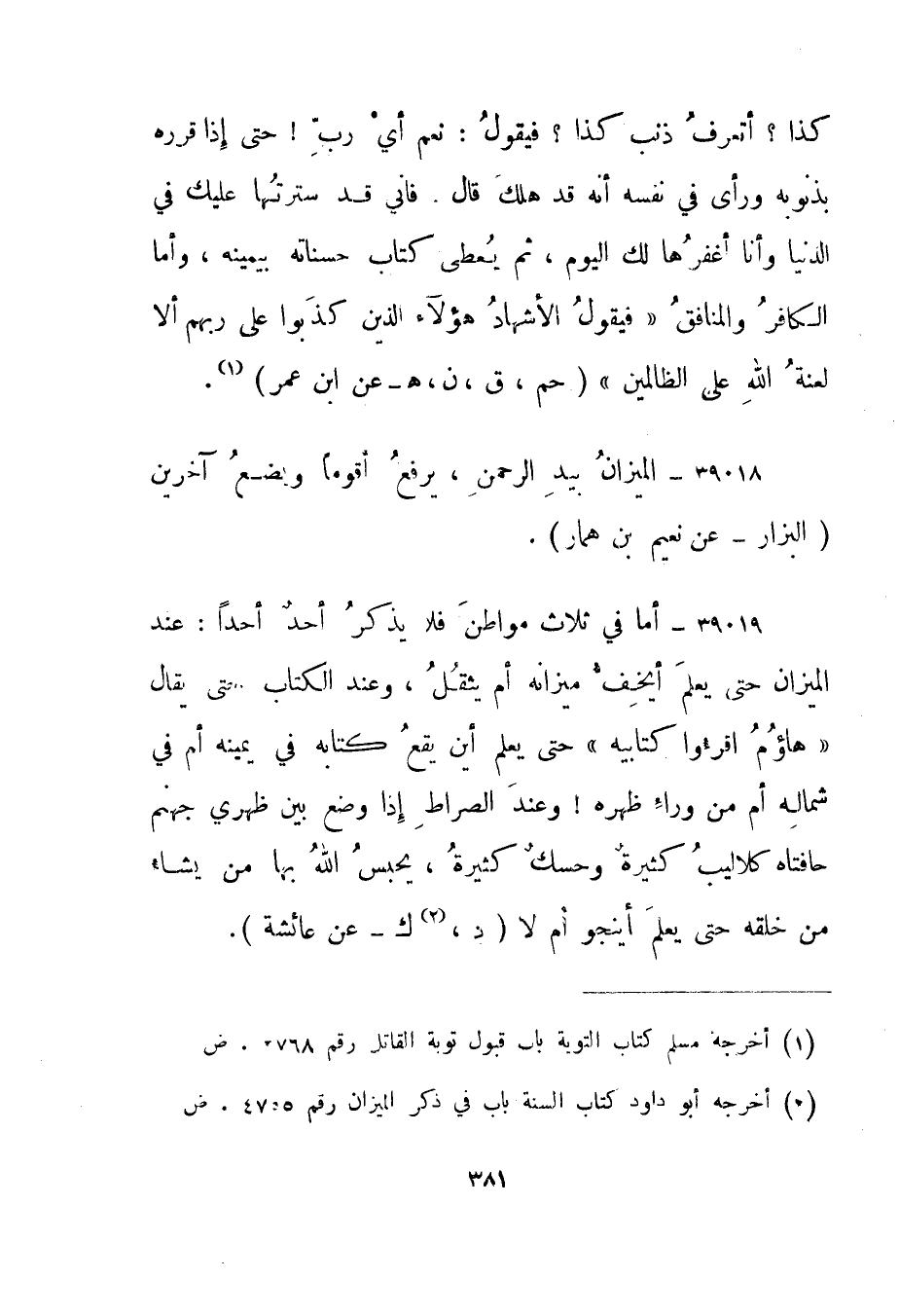 39018- "الميزان بيد الرحمن، يرفع أقوما ويضع آخرين." البزار - عن نعيم بن همار".