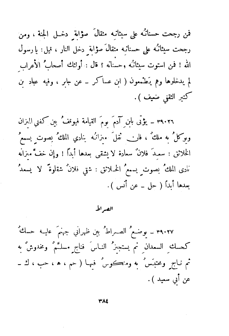 39027- "يوضع الصراط بين ظهراني جهنم عليه حسك كحسك السعدان ثم يستجيز الناس فناج مسلم ومخدوش به ثم ناج ومحتبس به ومنكوس فيها." حم، هـ، حب، ك - عن أبي سعيد".