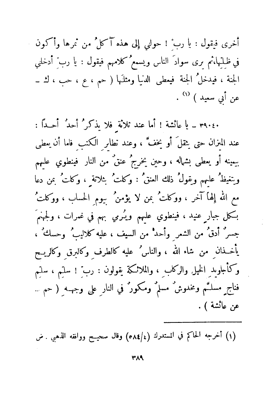 39040- "يا عائشة! أما عند ثلاثة فلا يذكر أحد أحدا: عند الميزان حتى يثقل أو يخف، وعند تطاير الكتب فأما أن يعطى بيمينه أو يعطى بشماله، وحين يخرج عنق من النار فينطوي عليهم ويتغيظ عليهم ويقول ذلك العنق: وكلت بثلاثة، وكلت بمن دعا مع الله إلها آخر، ووكلت بمن لا يؤمن بيوم الحساب، ووكلت بكل جبار عنيد، فينطوي عليهم ويرمي بهم في غمرات، ولجهنم جسر أدق من الشعر وأحد من السيف، عليه كلاليب وحسك، يأخذان من شاء الله، والناس عليه كالطرف وكالبرق وكالريح وكأجاويد الخيل والركاب، والملائكة يقولون: رب! سلم، سلم فناج مسلم ومخدوش مسلم ومكور في النار على وجهه." حم - عن عائشة".