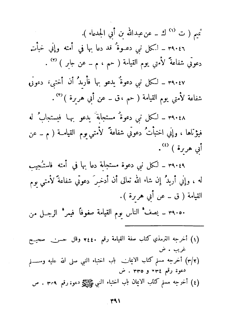 39046- "لكل نبي دعوة قد دعا بها في أمته وإني خبأت دعوتي شفاعة لأمتي يوم القيامة." حم، م - عن جابر"2