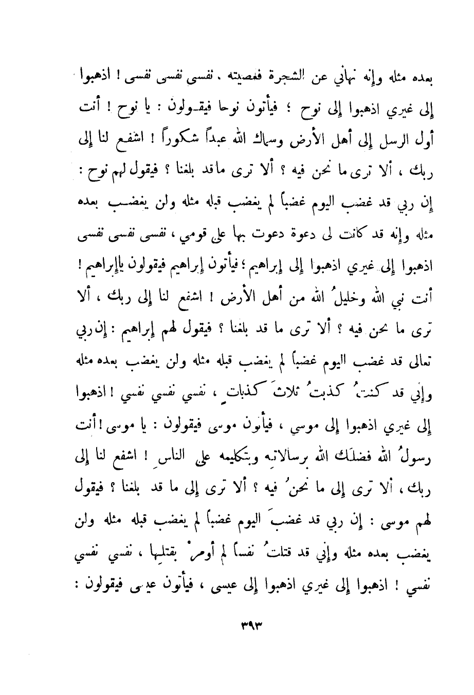 بعده مثله وإنه نهاني عن الشجرة فعصيته، نفسي نفسي نفسي! اذهبوا إلى غيري اذهبوا إلى نوح؛ فيأتون نوحا فيقولون: يا نوح! أنت أول الرسل إلى أهل الأرض وسماك الله عبدا شكورا! اشفع لنا إلى ربك، ألا ترى ما نحن فيه! ألا ترى ما قد بلغنا؟ فيقول لهم نوح: إن ربي قد غضب اليوم غضبا لم يغضب قبله مثله ولن يغضب بعده مثله وإنه قد كانت لي دعوة دعوت بها على قومي، نفسي نفسي نفسي اذهبوا إلى غيري اذهبوا إلى إبراهيم. فيأتون إبراهيم فيقولون يا إبراهيم! أنت نبي الله وخليل الله من أهل الأرضّ! اشفع لنا إلى ربك، ألا ترى ما نحن فيه؟ ألا ترى ما قد بلغنا؟ فيقول لهم إبراهيم: إن ربي تعالى قد غضب اليوم غضبا لم يغضب قبله مثله ولن يغضب بعده مثله وإني قد كنت كذبت ثلاث كذبات، نفسي نفسي نفسي! اذهبوا إلى غيري اذهبوا إلى موسى، فيأتون موسى فيقولون: يا موسى! أنت رسول الله فضلك الله برسالاته وبتكليمه على الناس! اشفع لنا إلى ربك، ألا ترى إلى ما نحن فيه؟ ألا ترى إلى ما قد بلغنا؟ فيقول لهم موسى: إن ربي قد غضب اليوم غضبا لم يغضب قبله مثله ولن يغضب بعده مثله وإني قد قتلت نفسا لم أومر بقتلها، نفسي نفسي نفسي! اذهبوا إلى غيري اذهبوا إلى عيسى، فيأتون عيسى فيقولون: