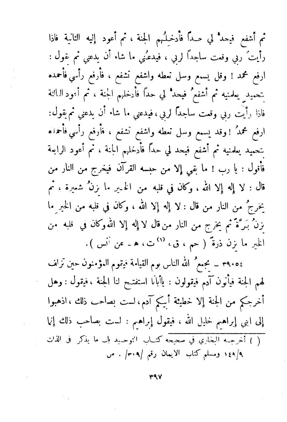 ثم أشفع فيحد لي حدا فأدخلهم الجنة، ثم أعود إليه الثانية فإذا رأيت ربي وقعت ساجدا لربي، فيدعني ما شاء أن يدعني ثم يقول: ارفع محمد! وقل يسمع وسل تعطه واشفع تشفع، فأرفع رأسي فأحمده بتحميد يعلمنيه ثم أشفع فيحد لي حدا فأدخلهم الجنة، ثم أعود الثالثة فإذا رأيت ربي وقعت ساجدا لربي، فيدعني ما شاء أن يدعني ثم يقول: ارفع محمد! وقد يسمع وسل تعطه واشفع تشفع، فأرفع رأسي فأحمده بتحميد يعلمنيه ثم أشفع فيحد لي حدا فأدخلهم الجنة، ثم أعود الرابعة فأقول: يا رب! ما بقي إلا من حبسه القرآن فيخرج من النار من قال: لا إله إلا الله، وكان في قلبه من الخير ما يزن شعيرة، ثم يخرج من النار من قال: لا إله إلا الله، وكان في قلبه من الخير ما يزن برة ثم يخرج من النار من قال لا إله إلا الله وكان في قلبه من الخير ما يزن ذرة." حم، ق،1 ت، هـ- عن أنس".