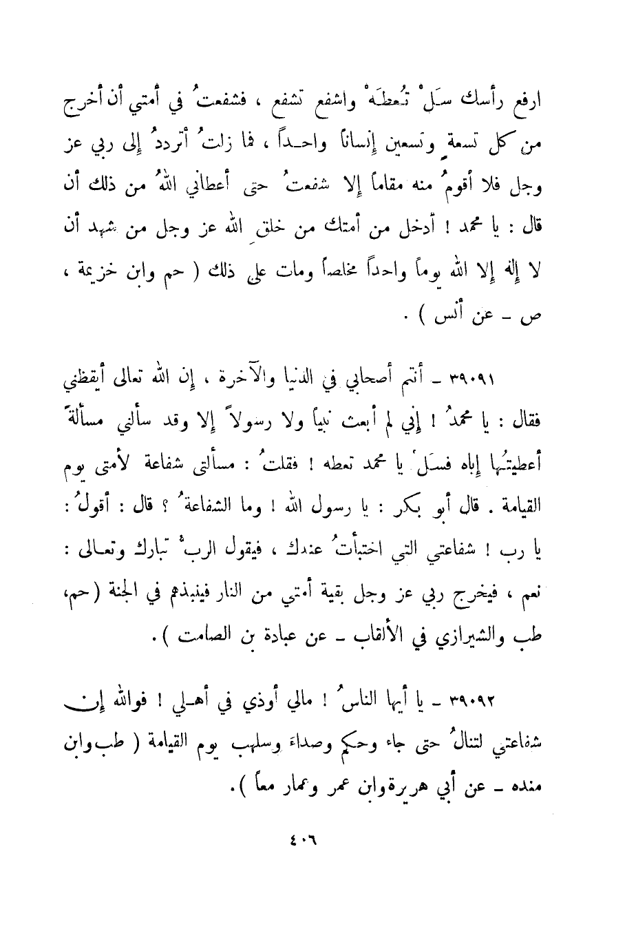 39092- "يا أيها الناس! ما لي أوذي في أهلي! فوالله إن شفاعتي لتنال حتى جاء وحكم وصداء وسلهب يوم القيامة." طب وابن منده - عن أبي هريرة وابن عمر وعمار معا".