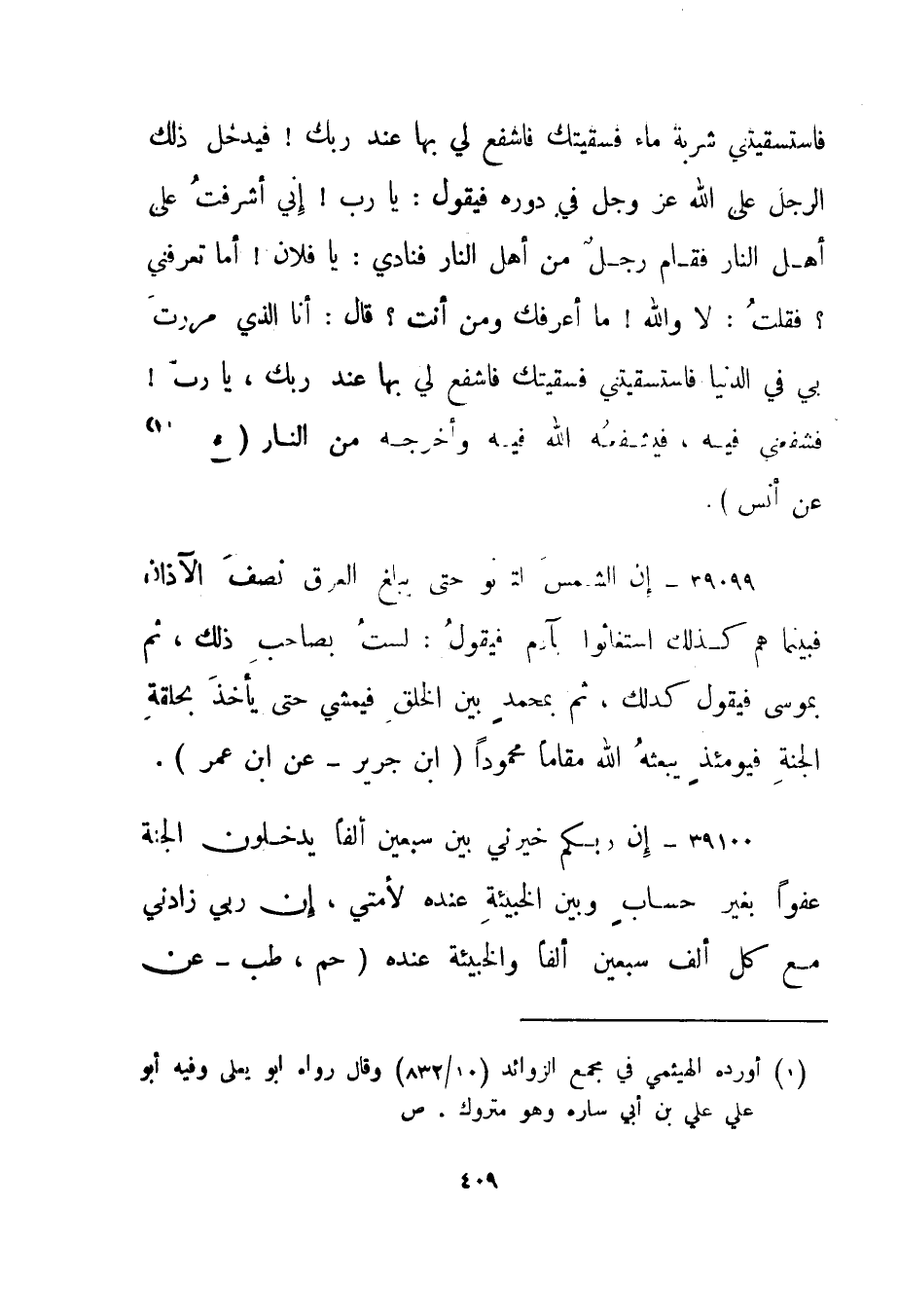 39099- "إن الشمس لتدنو حتى يبلغ العرق نصف الآذان فبينما هم كذلك استغاثوا بآدم فيقول: لست بصاحب ذلك، ثم بموسى فيقول كذلك، ثم بمحمد بين الخلق فيمشي حتى يأخذ بحلقة الجنة فيومئذ يبعثه الله مقاما محمودا." ابن جرير - عن ابن عمر".