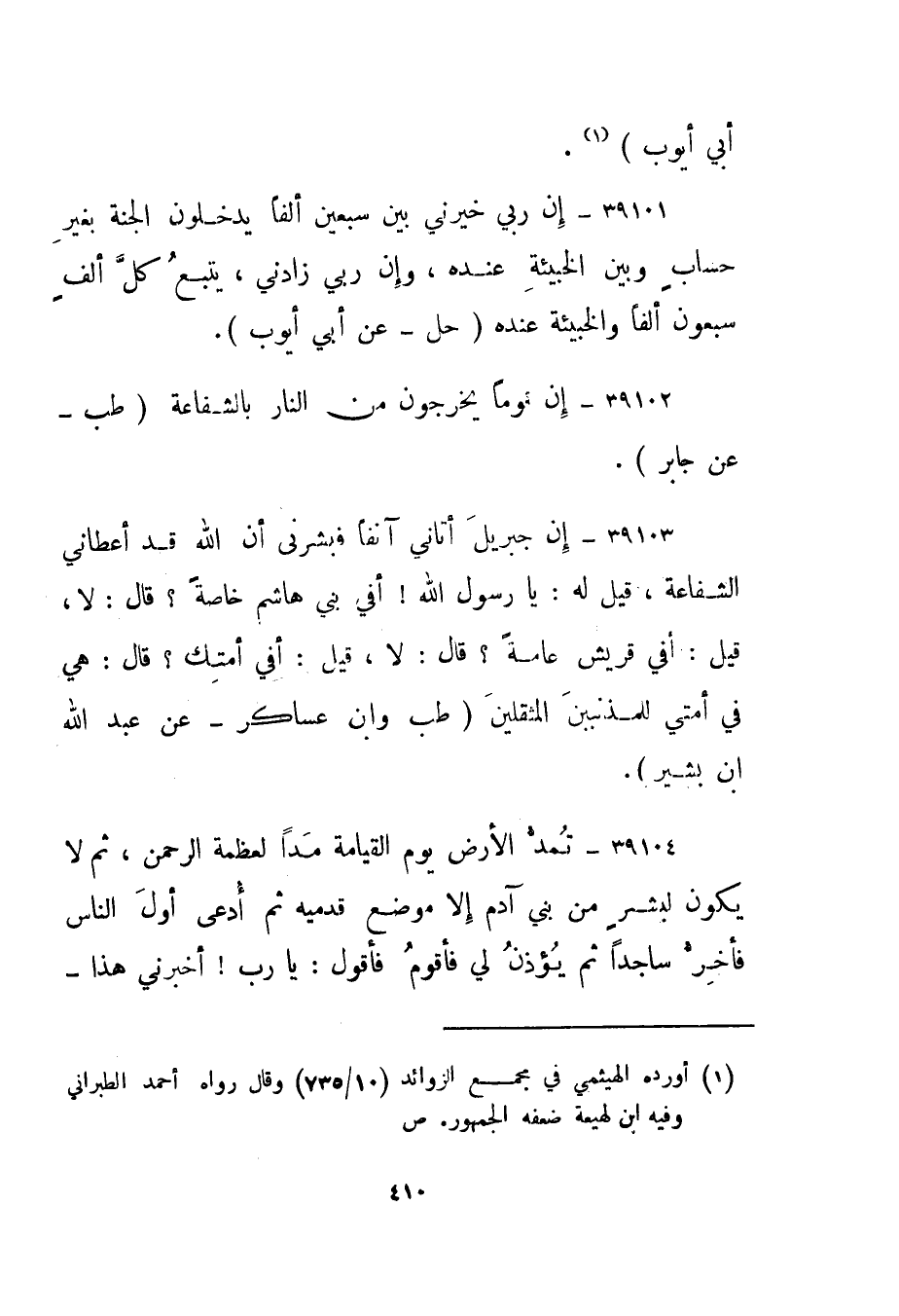 39104- "تمد الأرض يوم القيامة مدا لعظمة الرحمن، ثم لا يكون لبشر من بني آدم إلا موضع قدميه ثم أدعى أول الناس فأخر ساجدا ثم يؤذن لي فأقوم فأقول: يا رب! أخبرني هذا